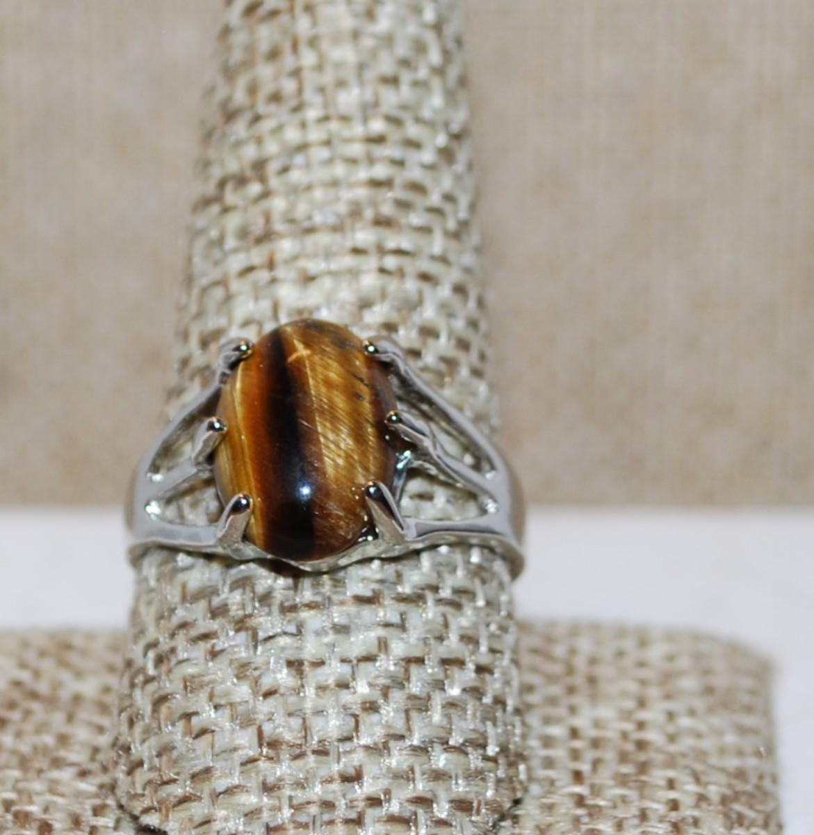 Size 10 Oval Tiger Eye Ring with Triple Lines Sides on a Silver Tone Band (4.0g)