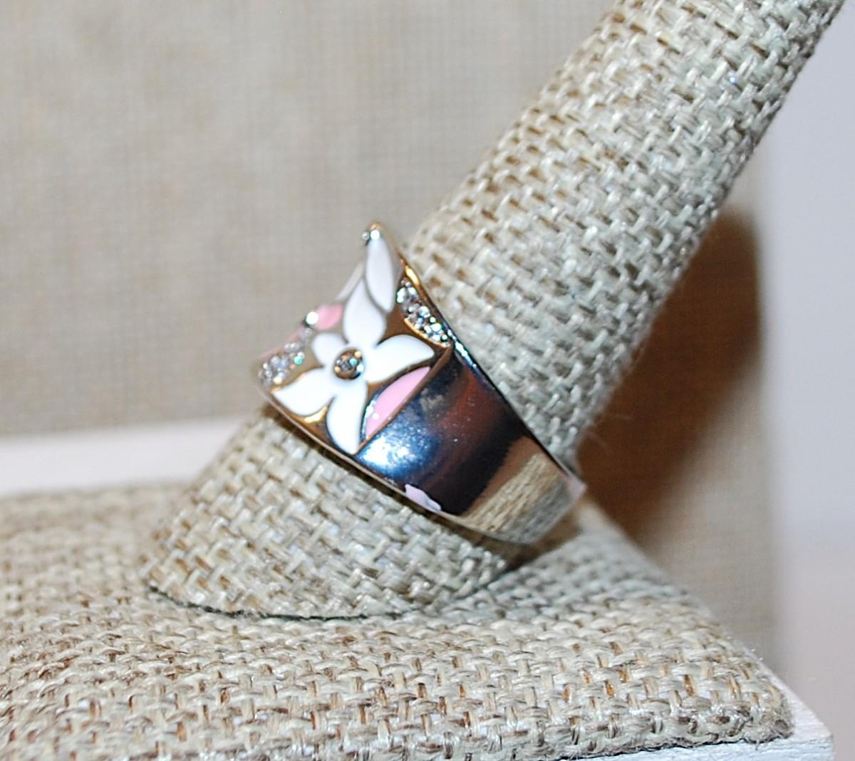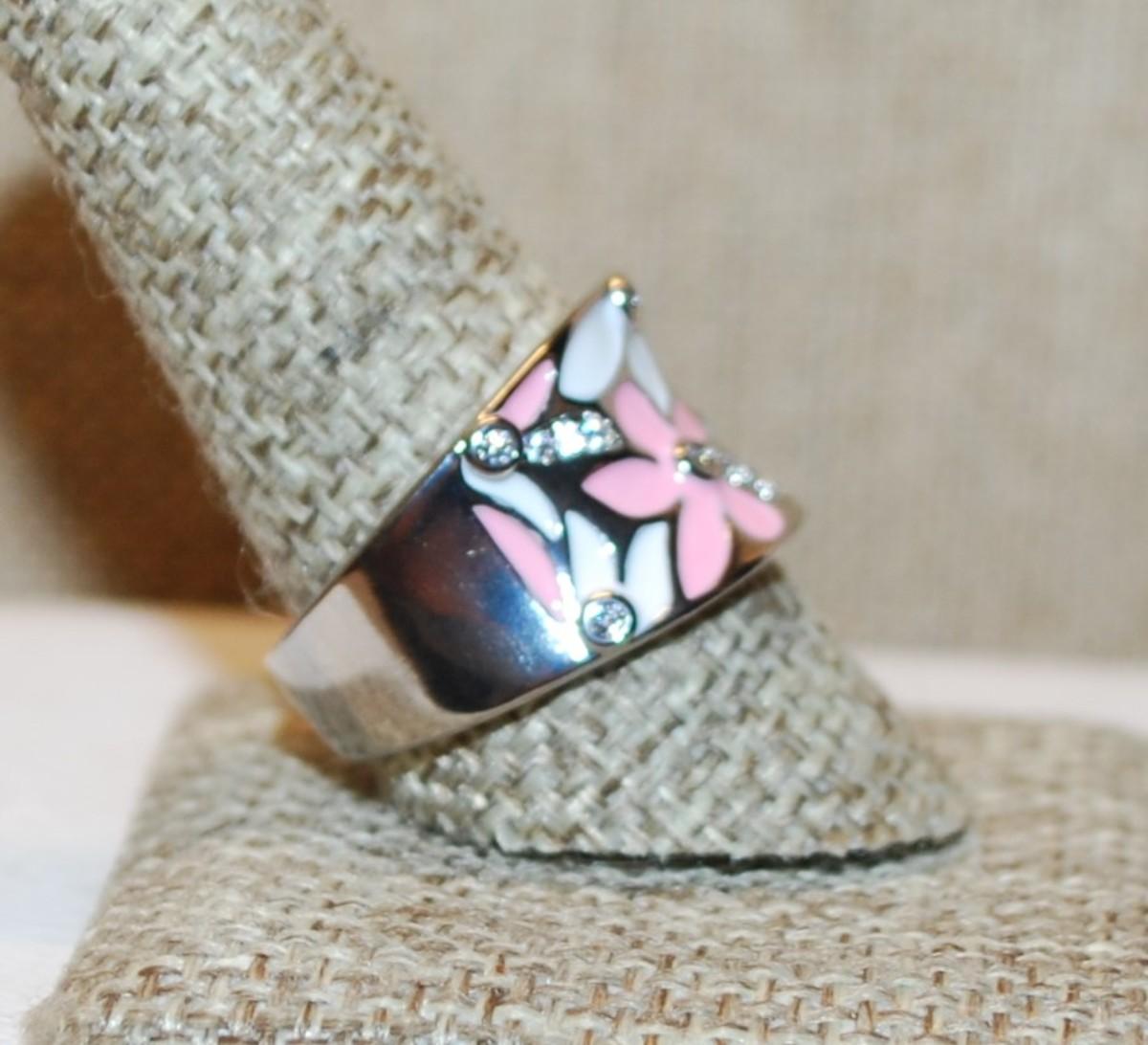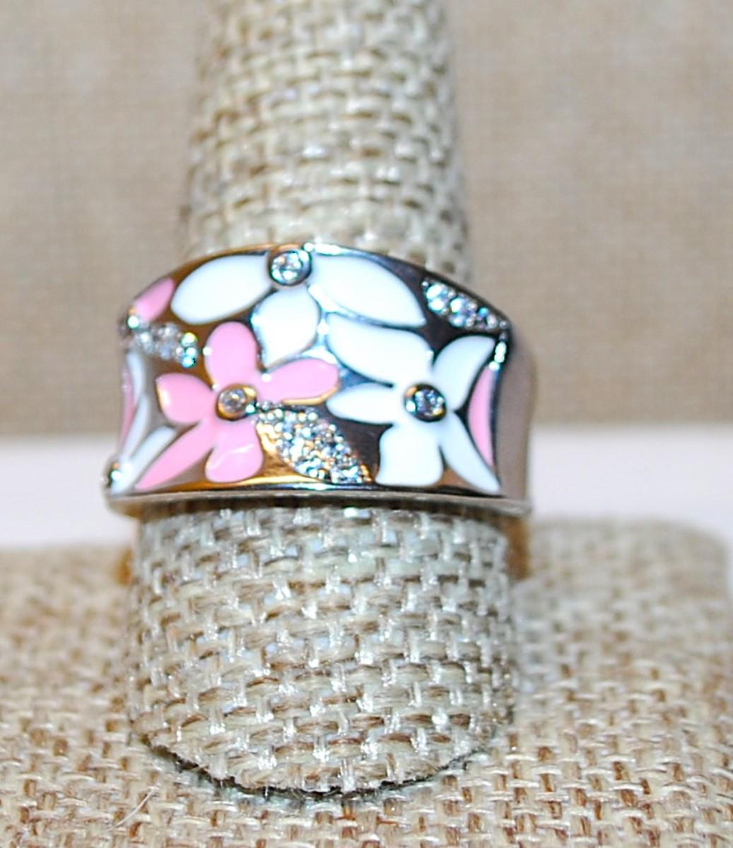 Size 10 ½ PINK & WHITE Enamel Design Flowers Ring with a Solid Silver Tone Band (8.7g)