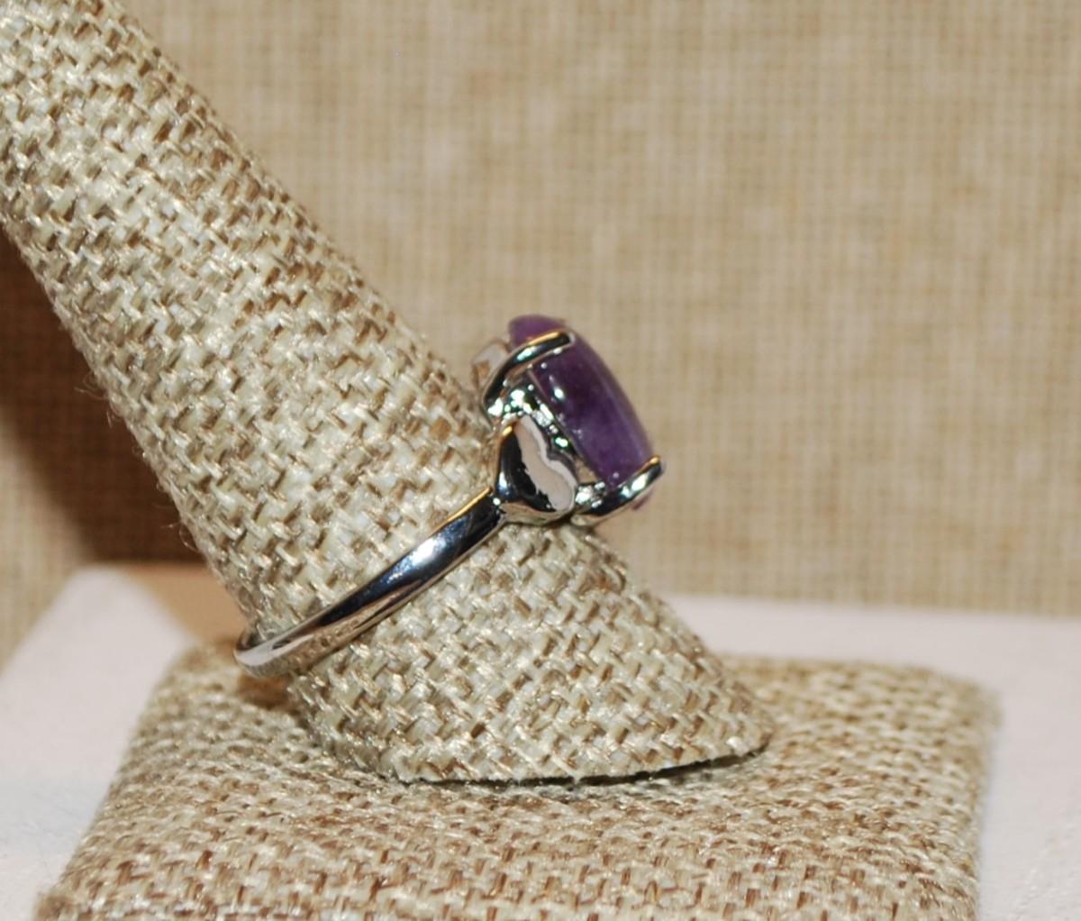 Size 10 PURPLE Oval Opaque Stone CABOCHON GEMSTONE Ring with Heart Side Accents on a Silver Tone Band (3.8g)