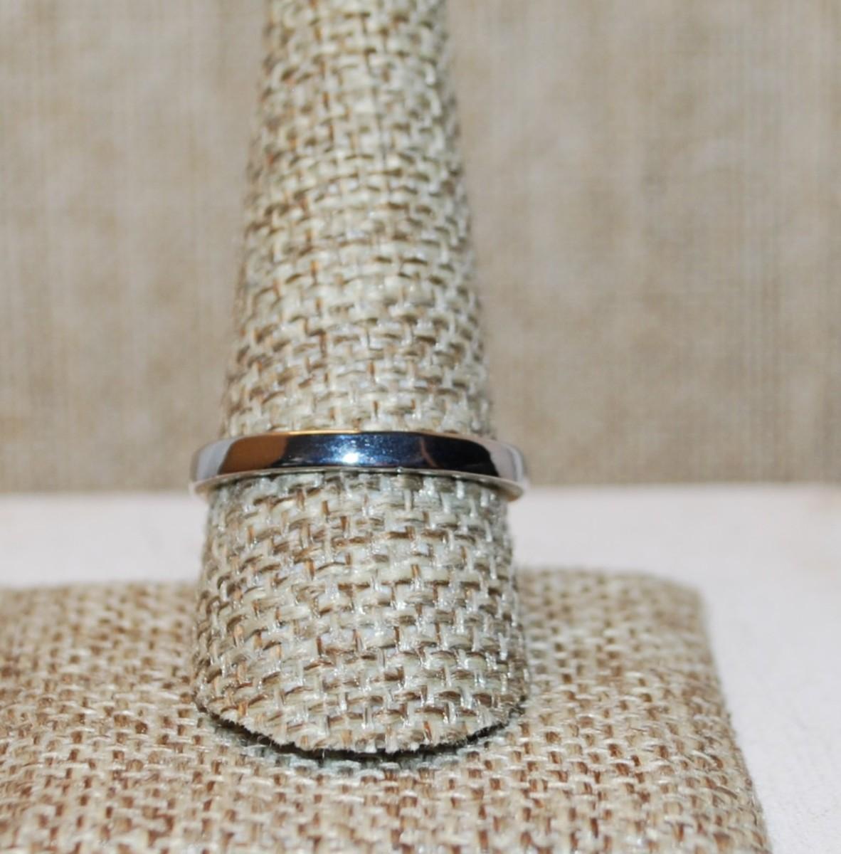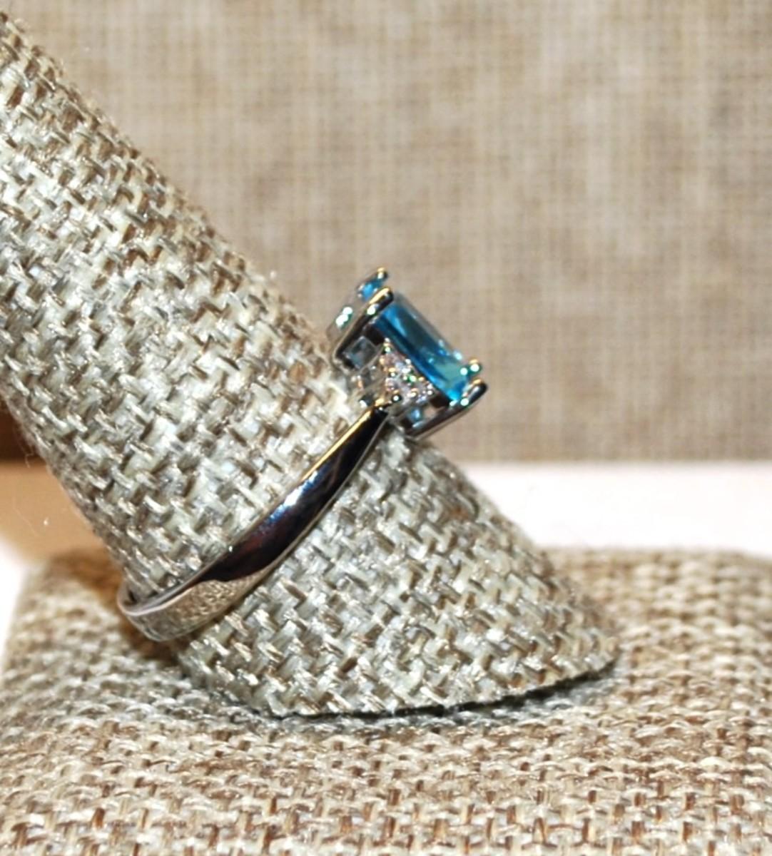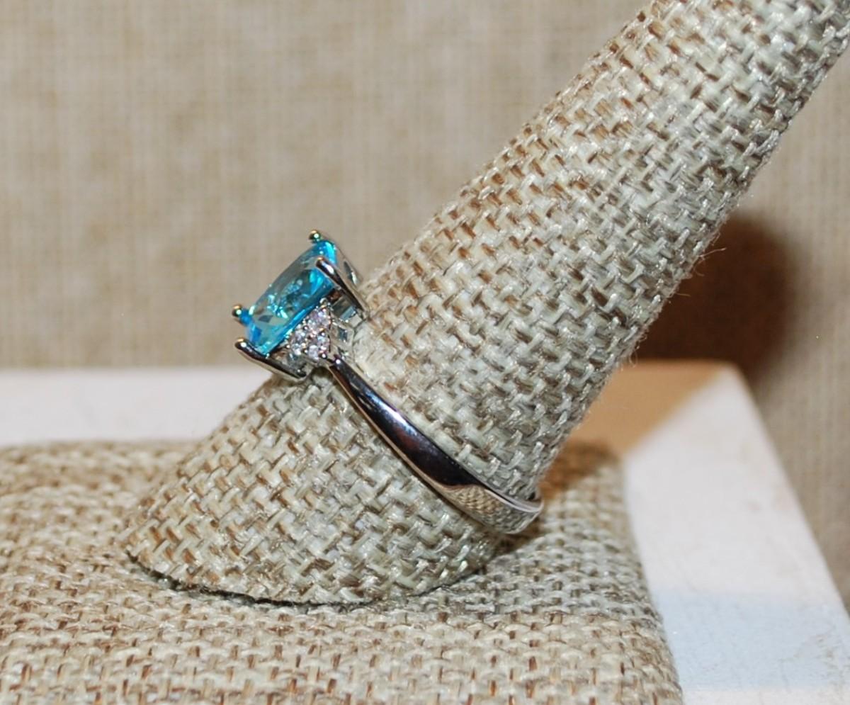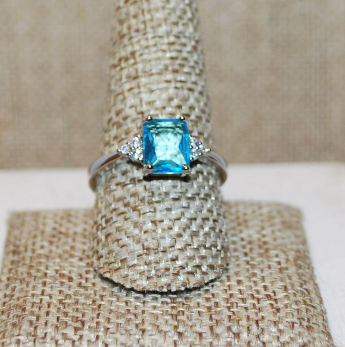 Size 10 Rectangle Shaped Transparent Blue Stone Ring with 3 Stone Side Accents on a Silver Tone Band (3.0g)