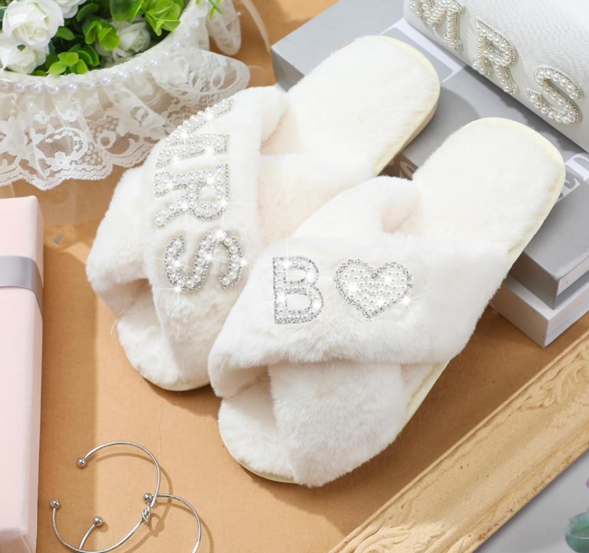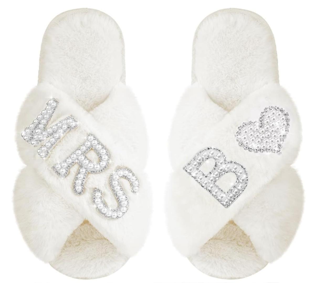 Size 10 Women's Bride Slippers Mrs B Slipper for Wedding with Personalized Initial Pearl Design