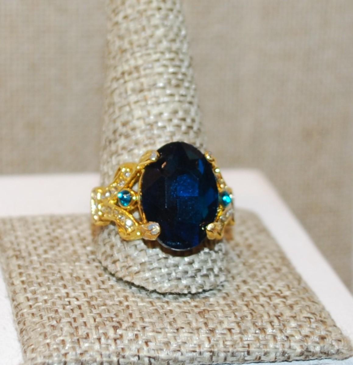 Size 11½ Large Blue Oval 4 Prong Stone Party Style Ring with Side Accents on a Gold Tone Band (8.2g)