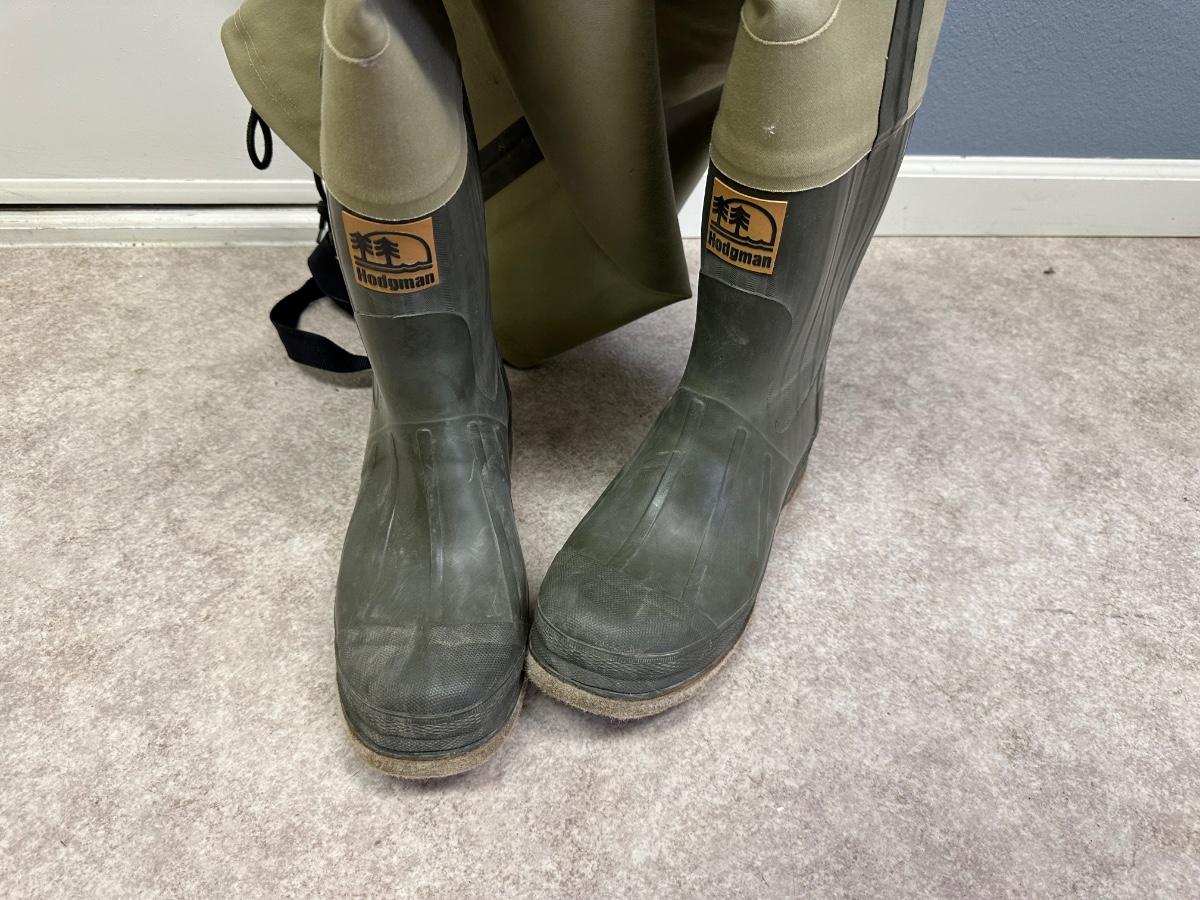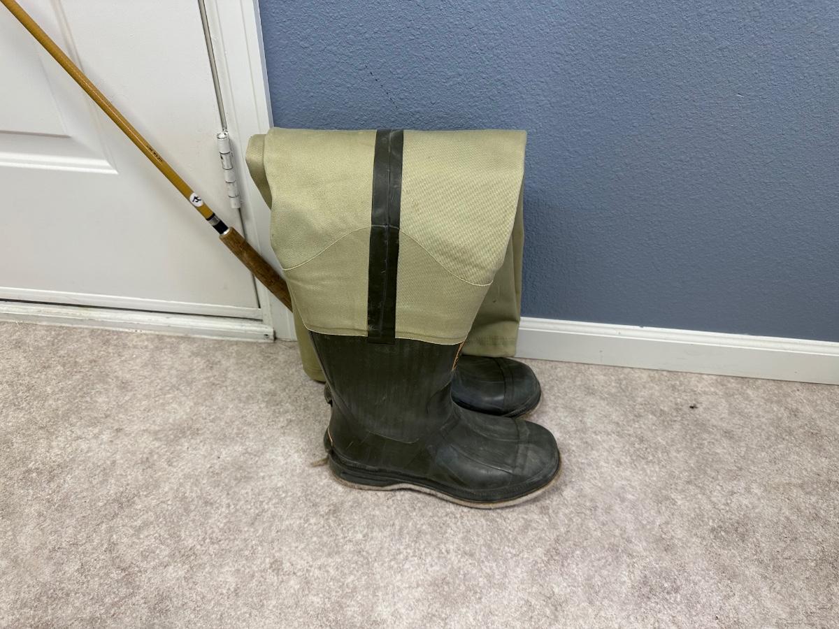 SIZE 11 MEN'S FISHING WADERS AND MARTIN REEL FISHING POLE