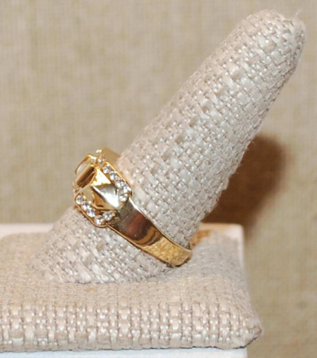 Size 11¼ Round Clear Stone with Line Accents Ring & Side Pyramid Sides on a Gold Tone Band (6.2g)