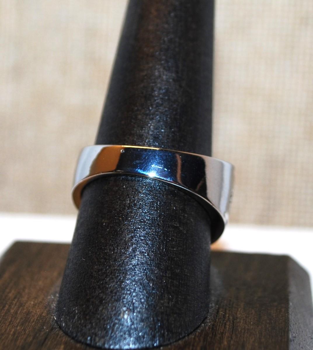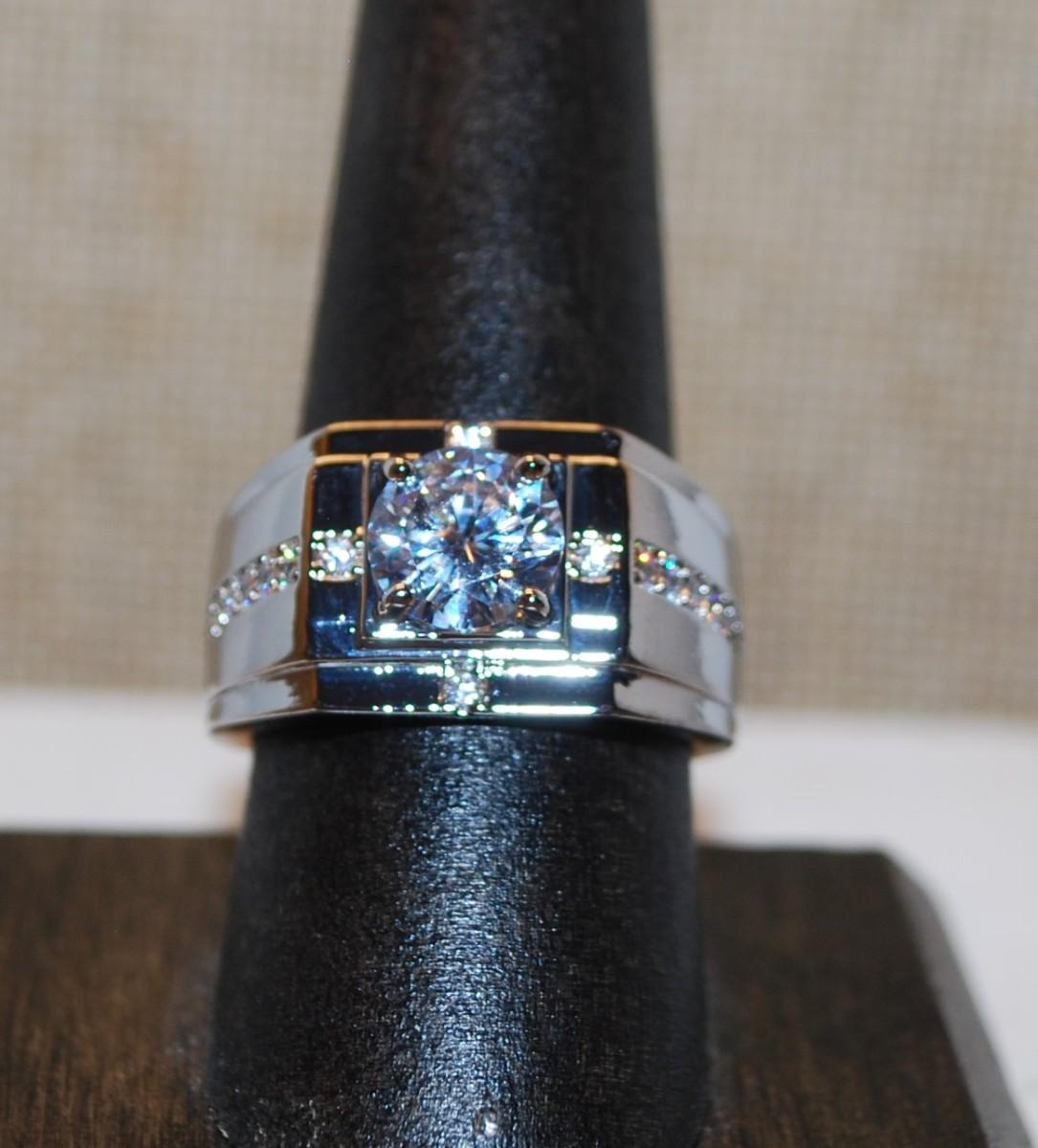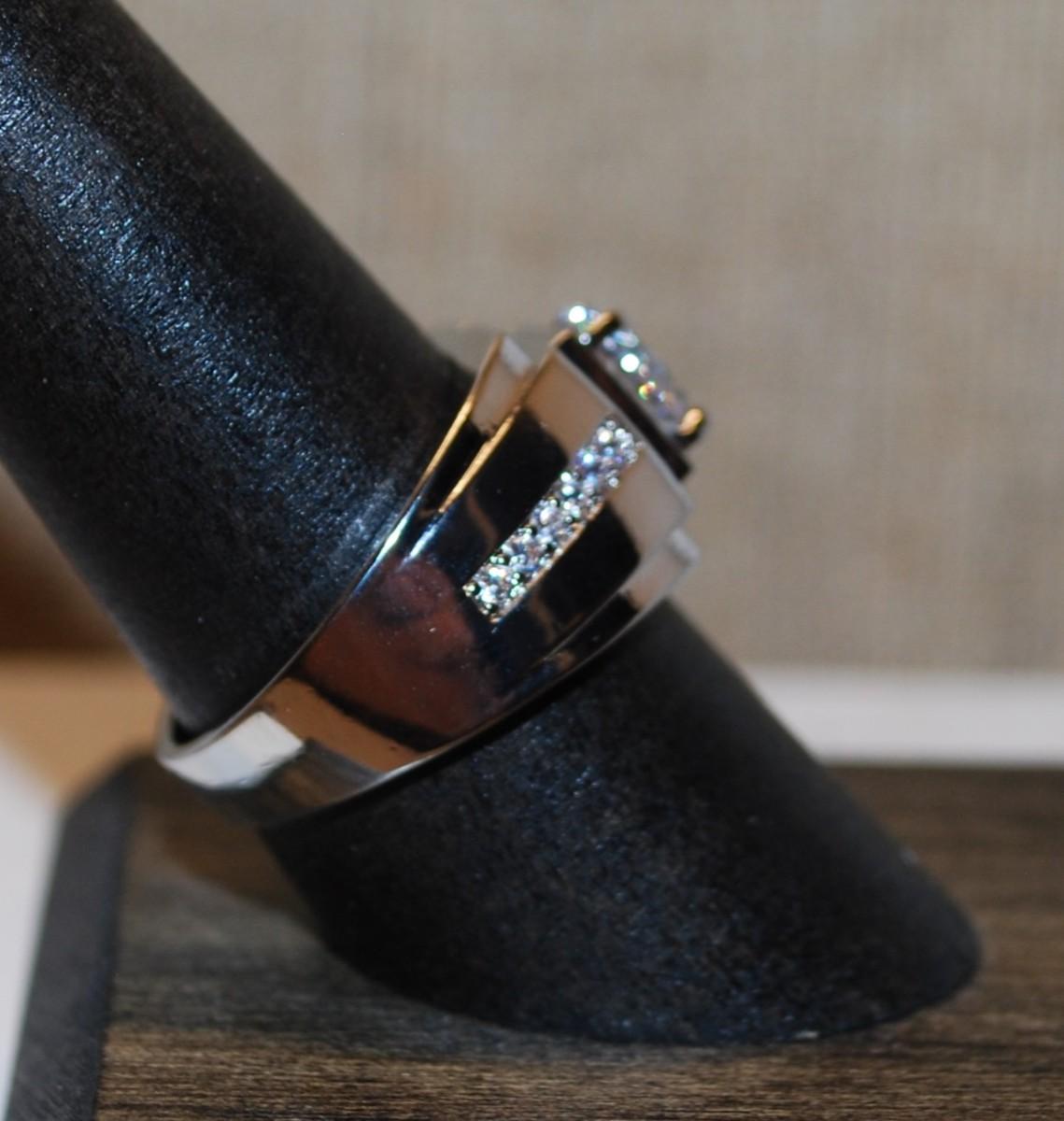 Size 11 Single Clear Center Stone Ring with Line Accents on a Solid Silver Tone Band (7.2g)