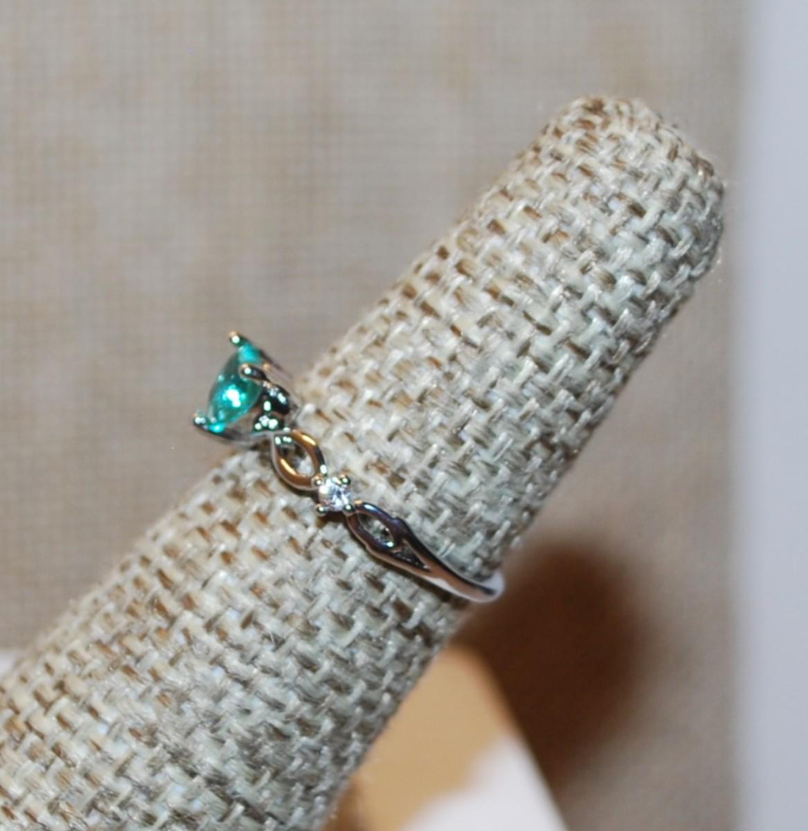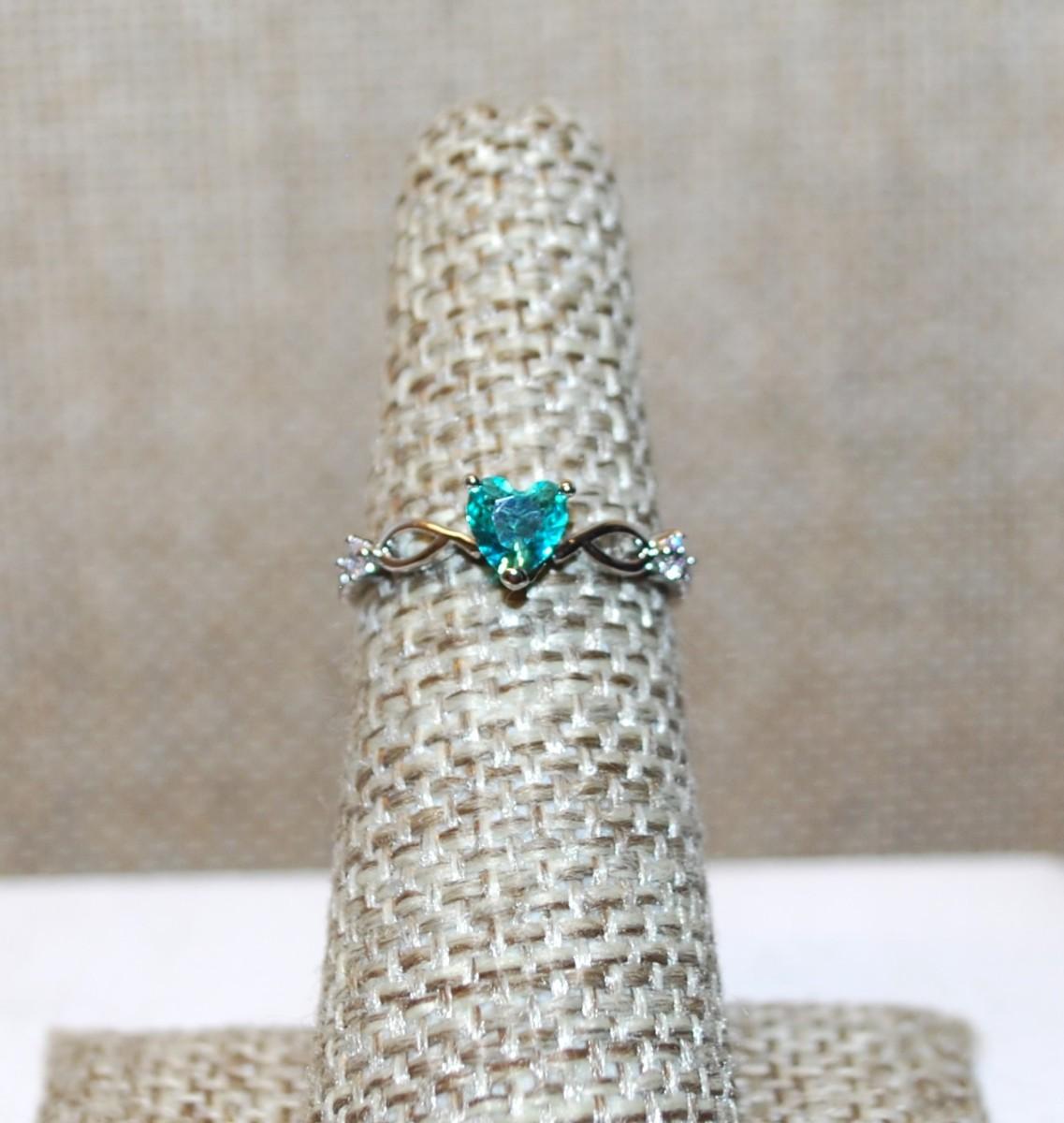 Size 5 Blue/Green HEART Stone with Twisted Setting and Side Accents on a Silver Tone Band (1.2g)