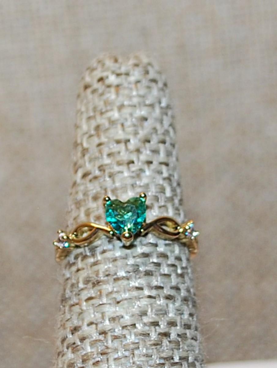 Size 5 Delicate BLUE/GREEN HEART Ring with Loops and Single Clear Stone Accents on a Gold Tone Band (1.1g)