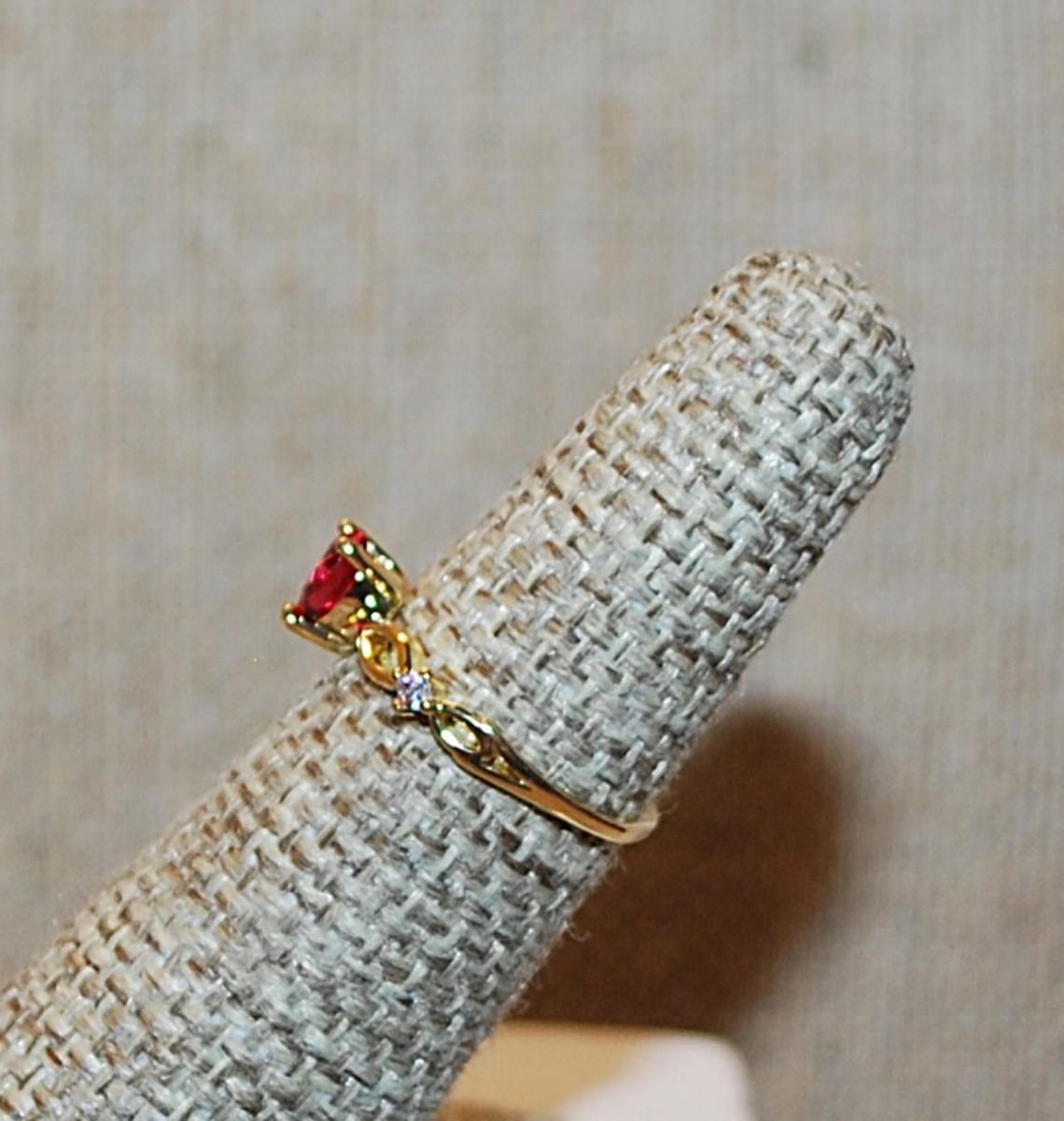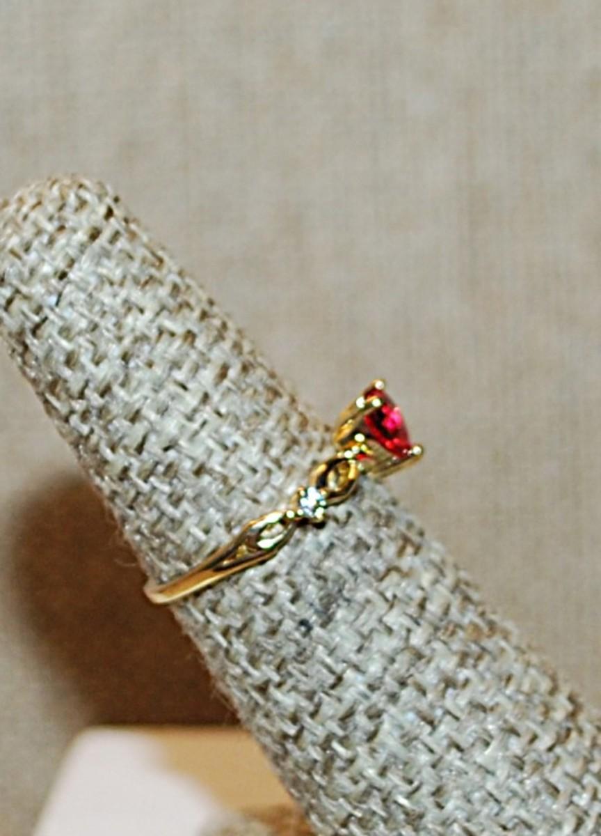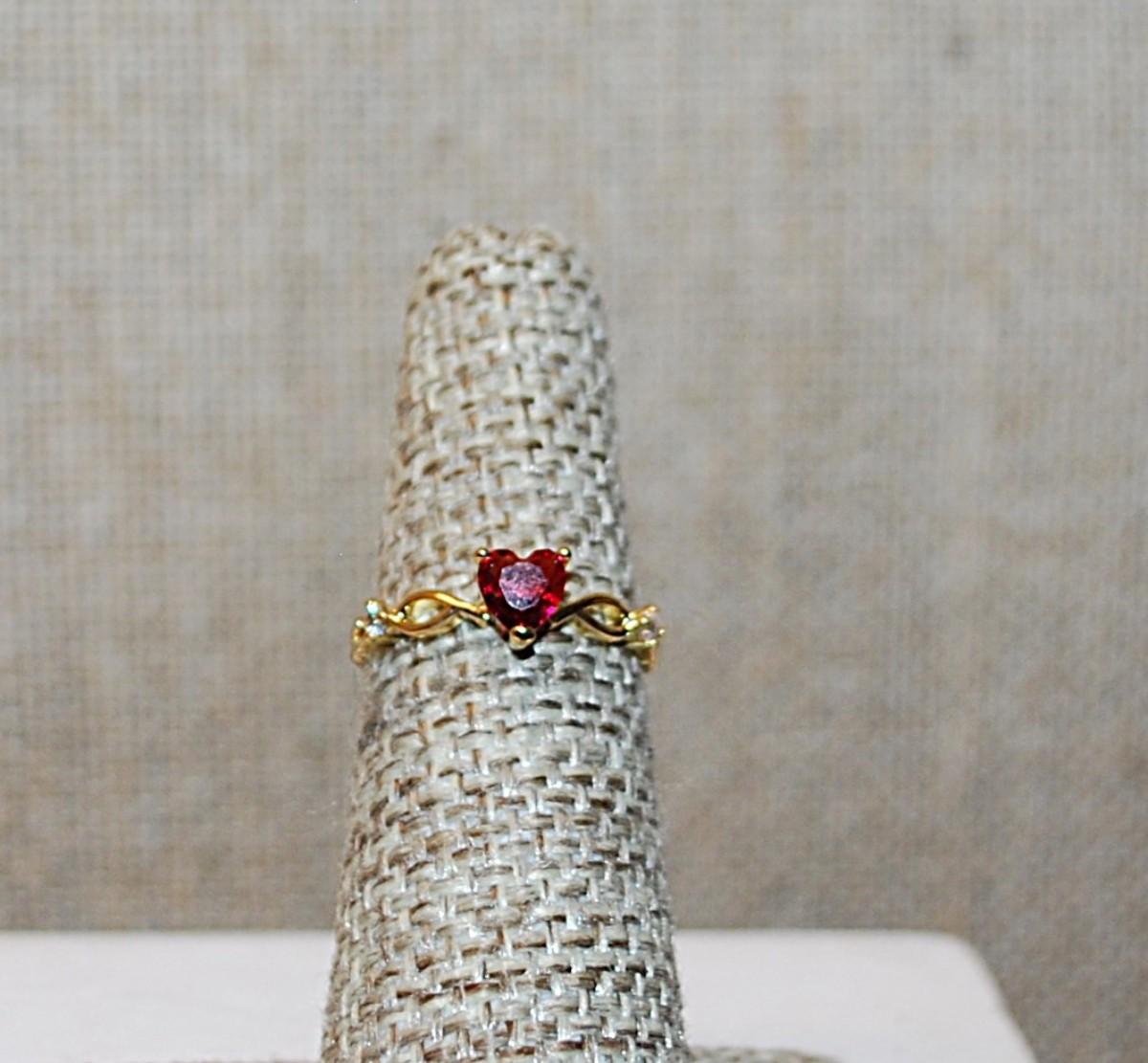 Size 5 Delicate RED HEART Ring with Loops and Single Clear Stone Accents on a Gold Tone Band (1.1g)