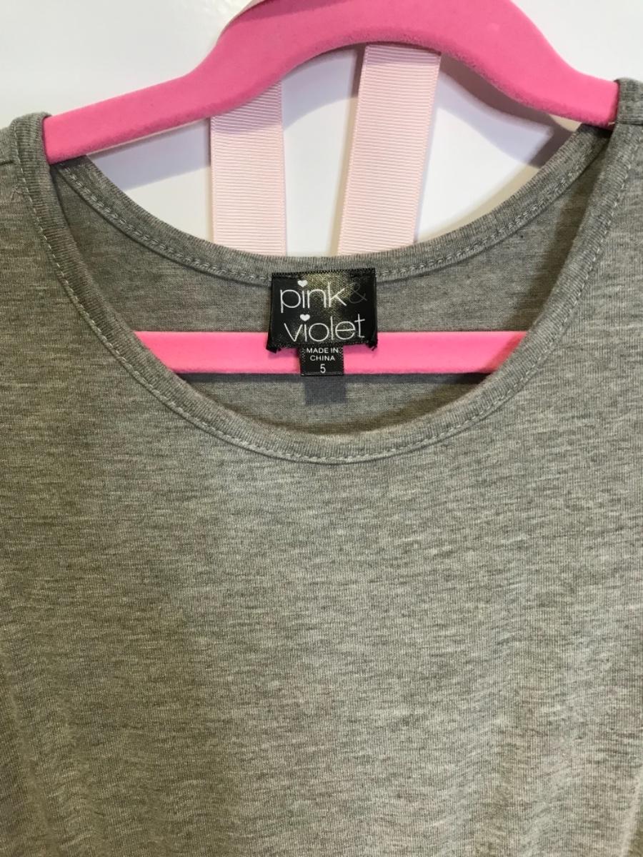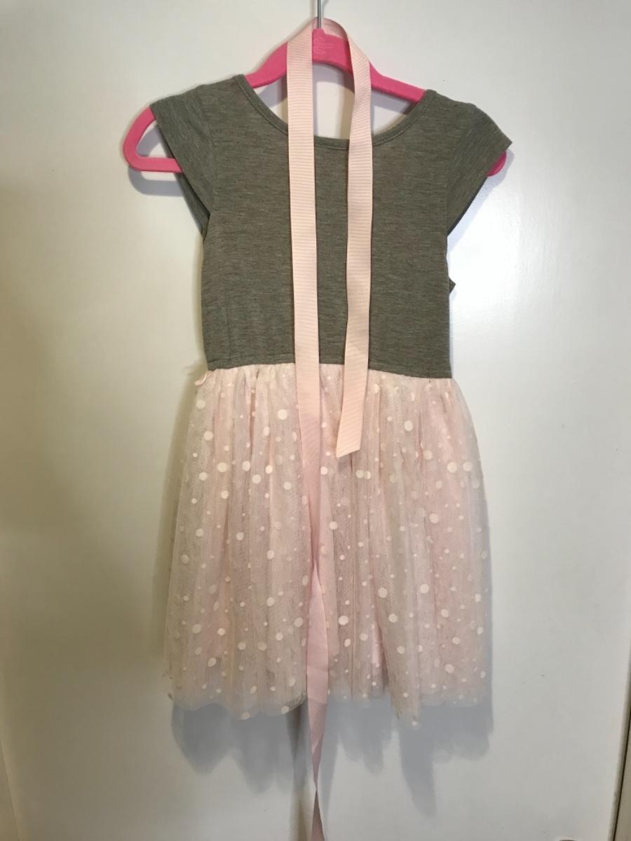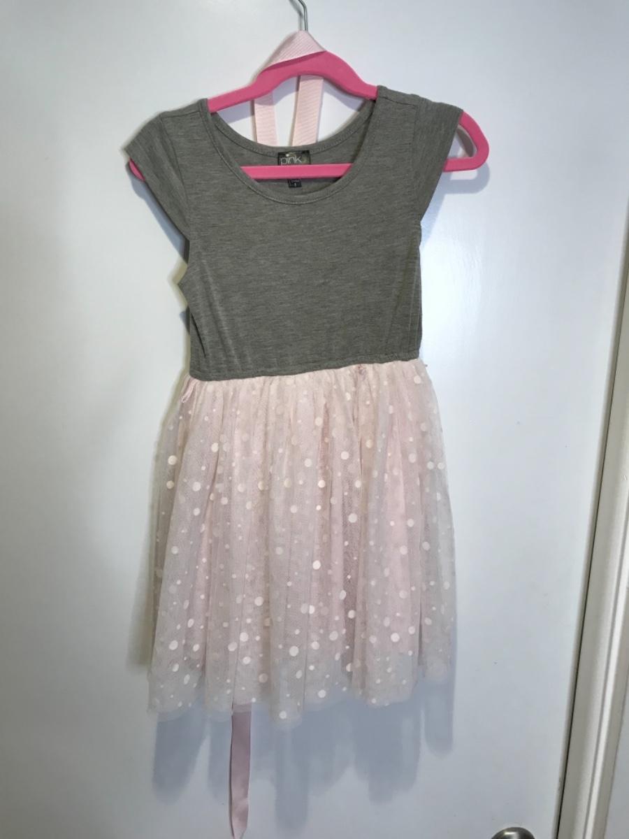 Grey jersey top with pink belt and pink polka dot skirt lined