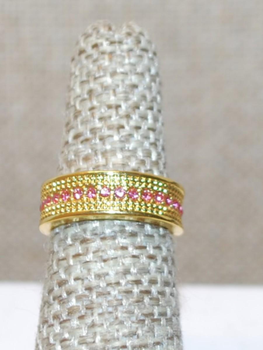 Size 5½ Half Infinity Style Ring with a Middle Line of Tiny Pink Stones on a Gold Tone Band (3.2g)