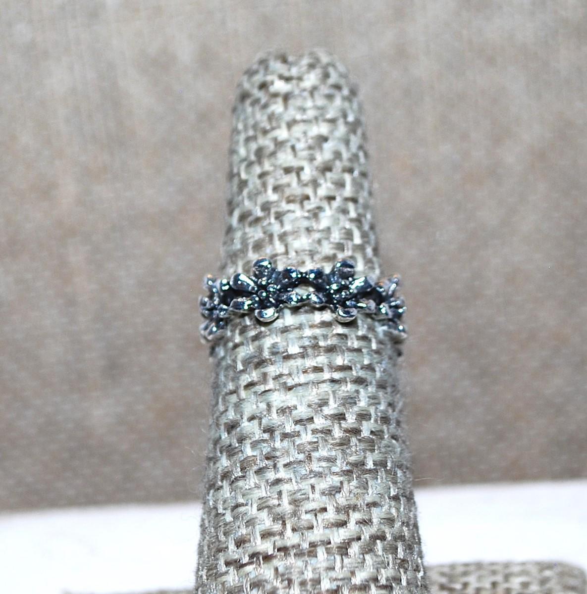 Size 5 Infinity Style Black & Silver Colored RING with FLOWER Designs on a Silver Tone Band (2.1g)