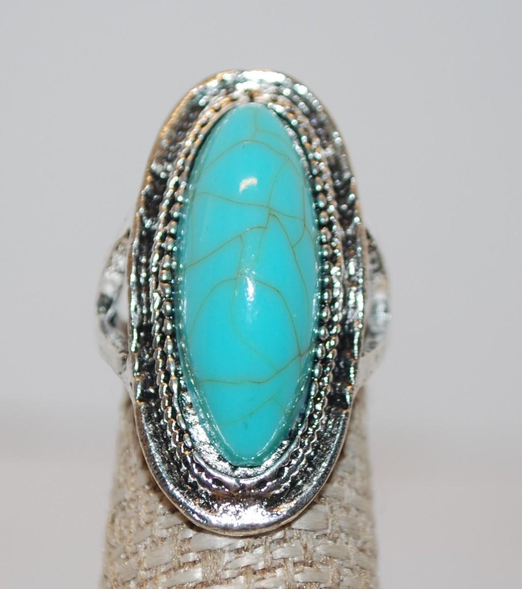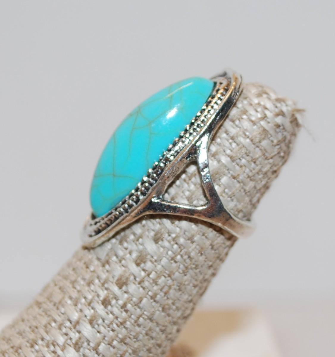 Size 5¾ Large Oval Turquoise-Styled Ring with Silver Tone Rope Surrounds (5.6g)