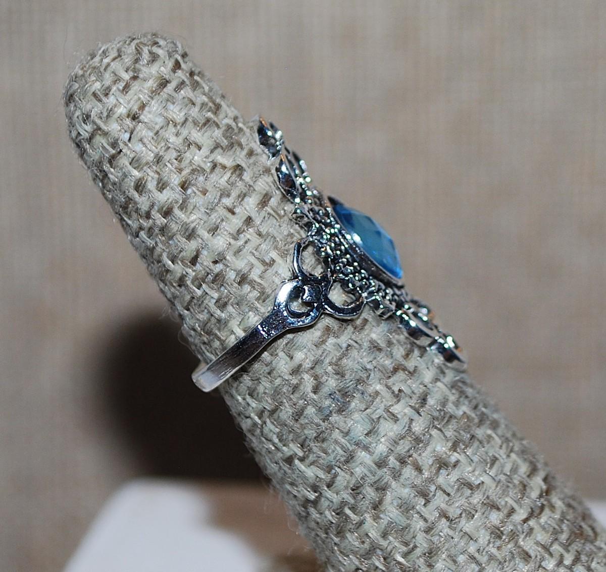 Size 5½ Light BLUE Oval Beveled Stone RING with Full Ornate Surround on a Silver Tone Setting (2.2g)