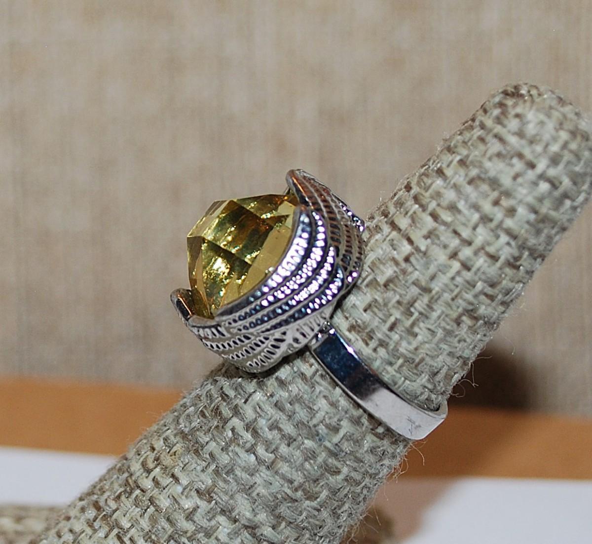 Size 5¾ Light YELLOW Beveled Clear Round Glass Stone RING in a Silver Tone Swirled "NEST" and Silver Tone Band (7.0g)