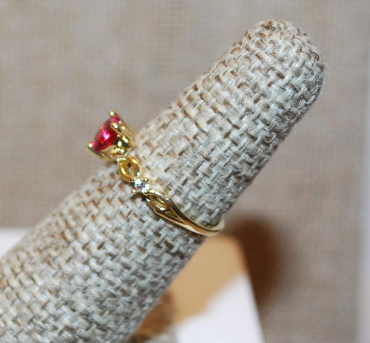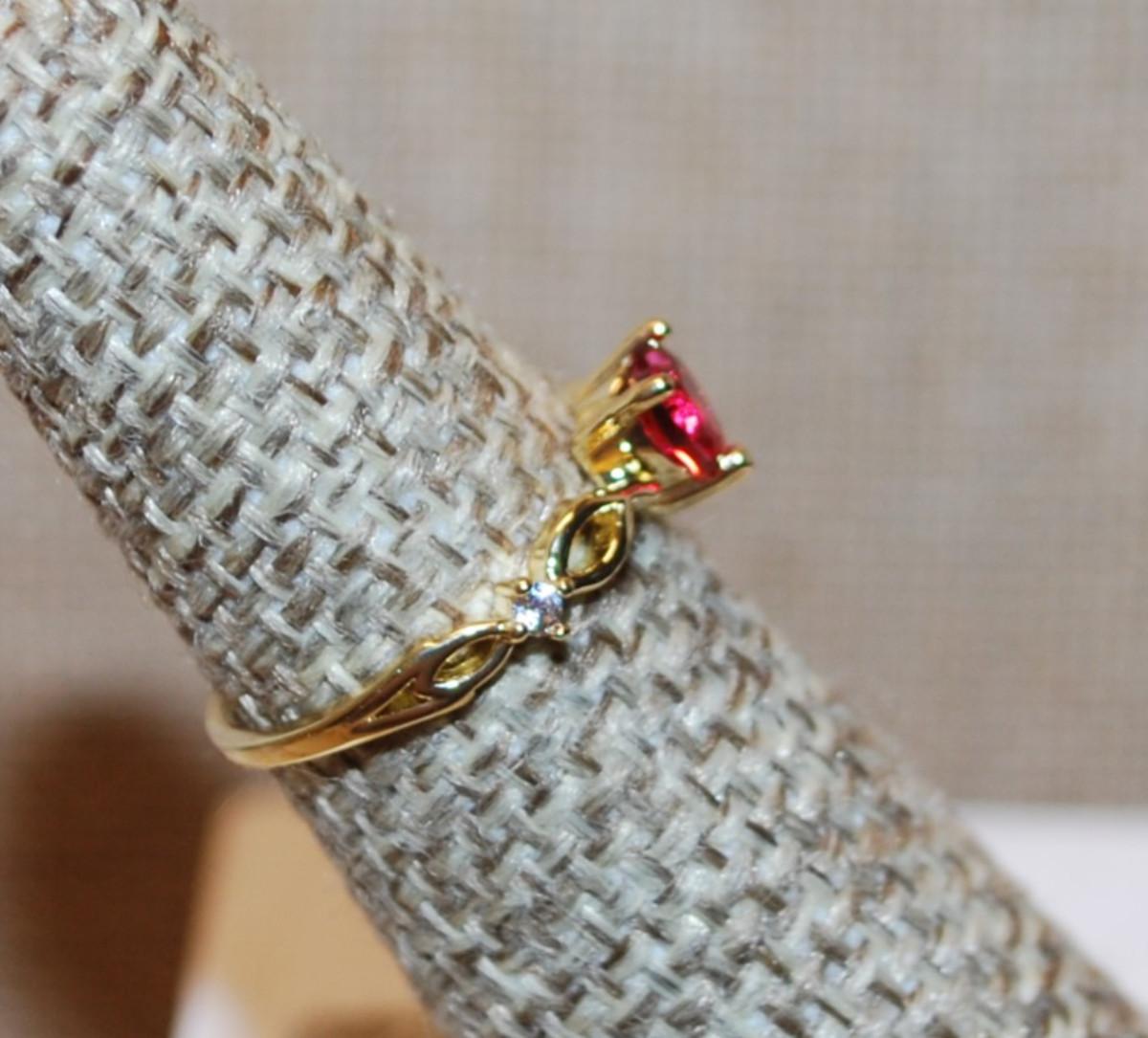 Size 5 Red HEART Ring with Twisted Sides & Accents on a Gold Tone Band (1.1g)
