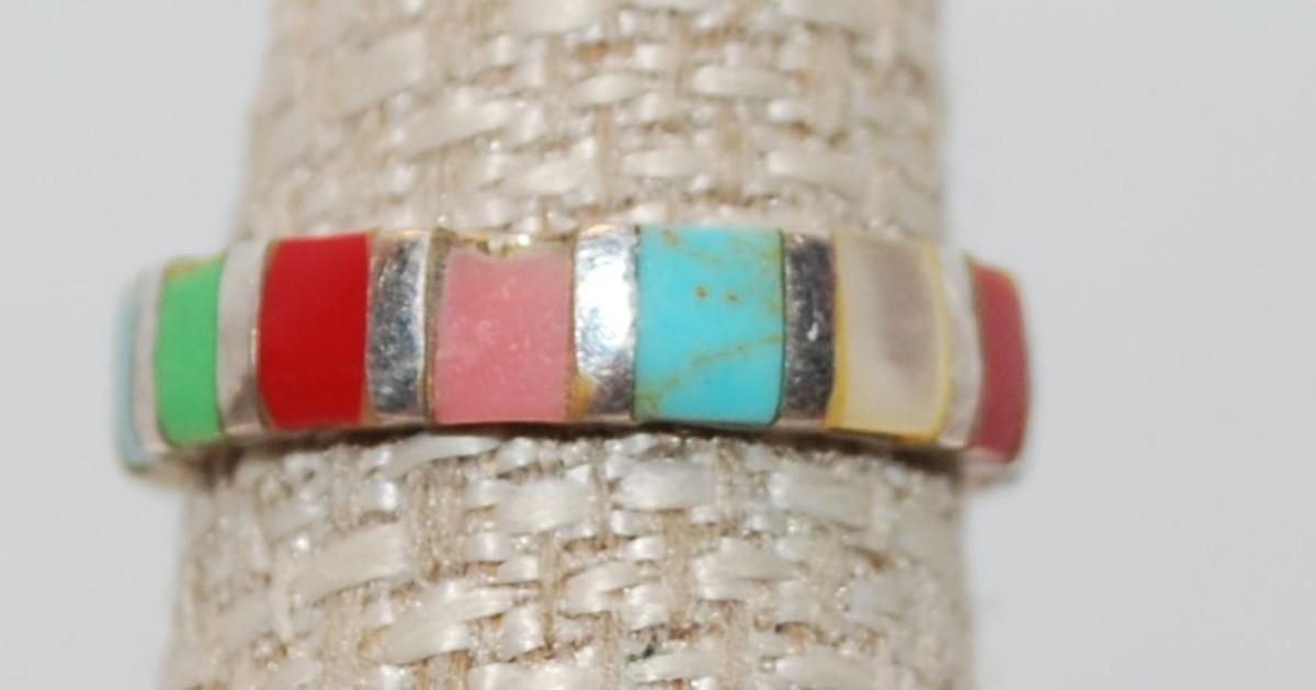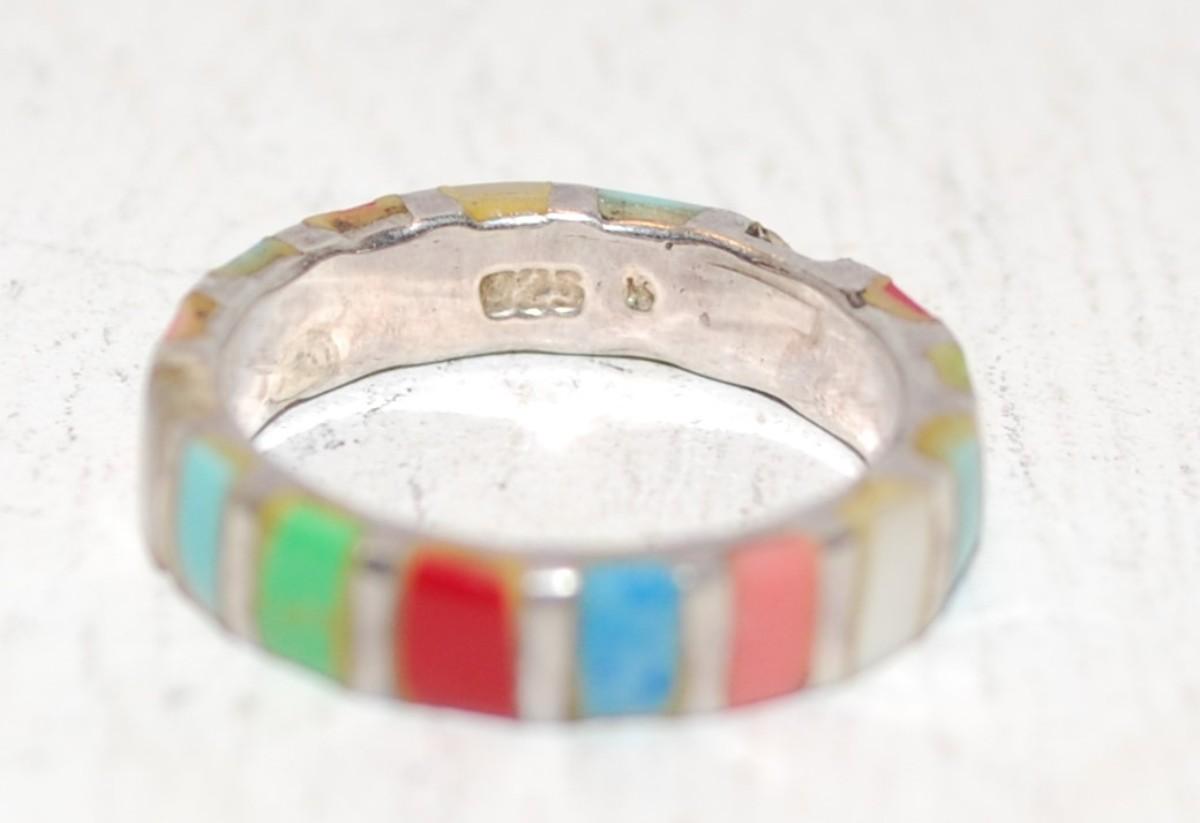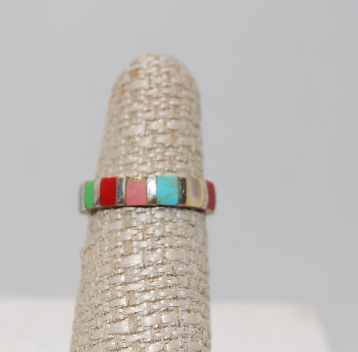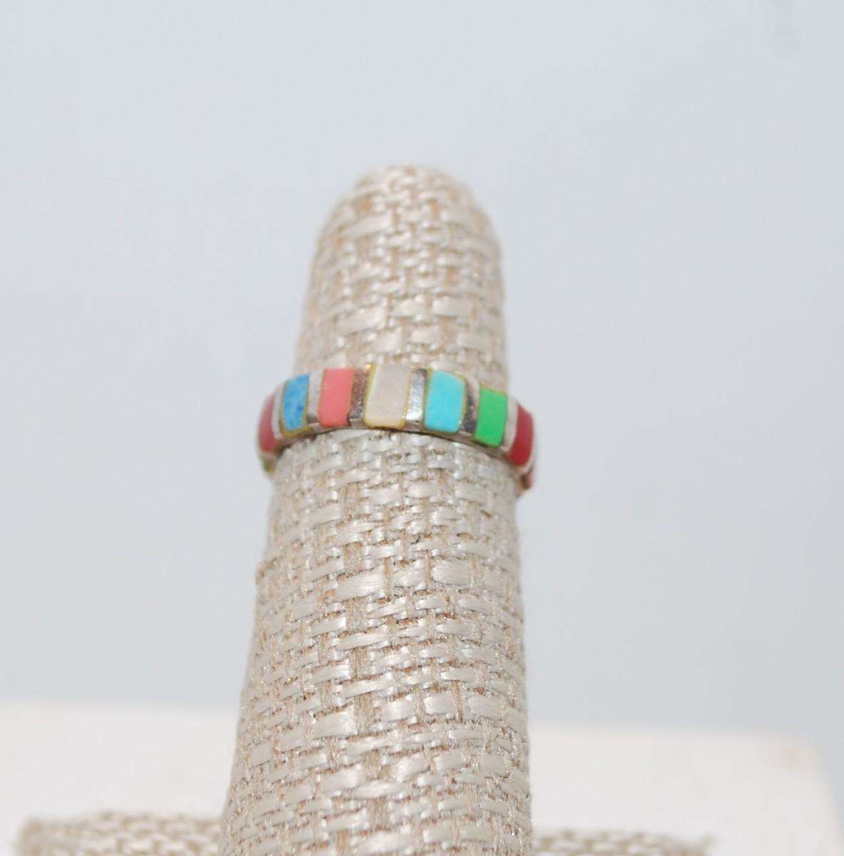 Size 5¾ STERLING SILVER Ring with Coral, Green, Red, Blue, Mother-of-Pearl Inlays (3.5g)