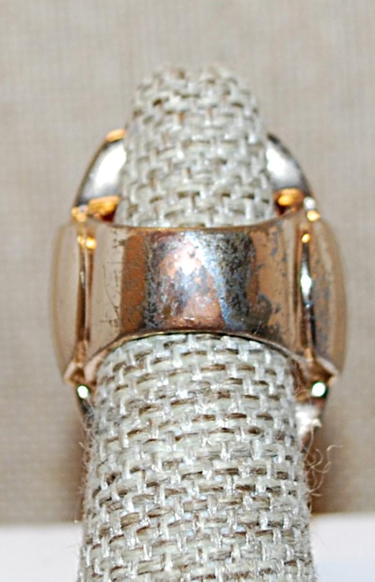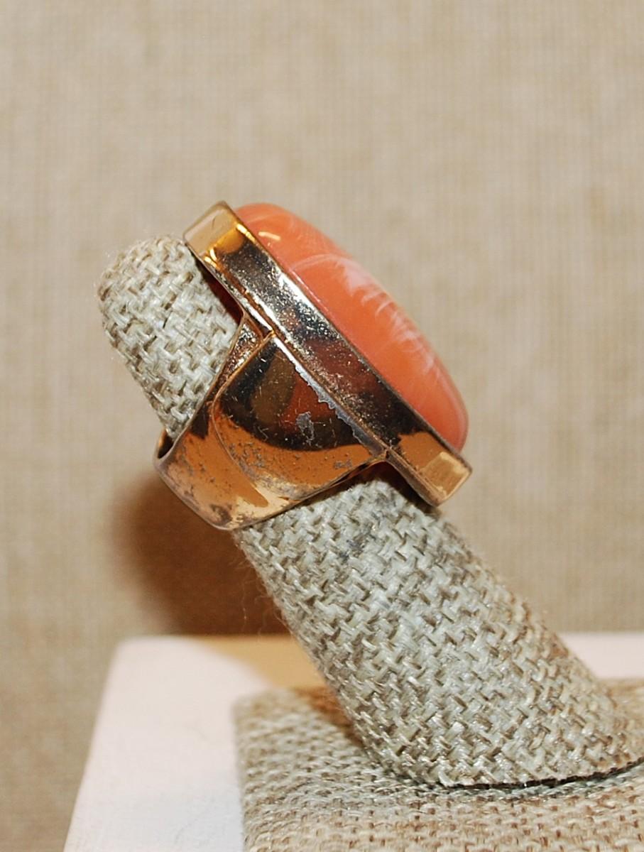 Size 5 VINTAGE Oversized Oval CORAL& White Splash Ring on a Solid Gold Tone Band (20.2g)