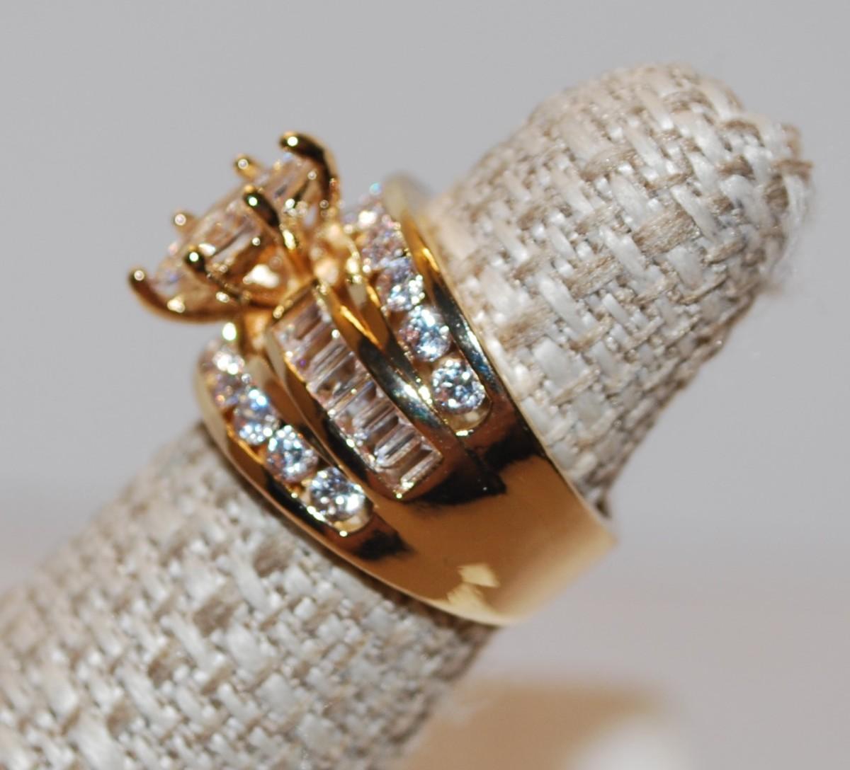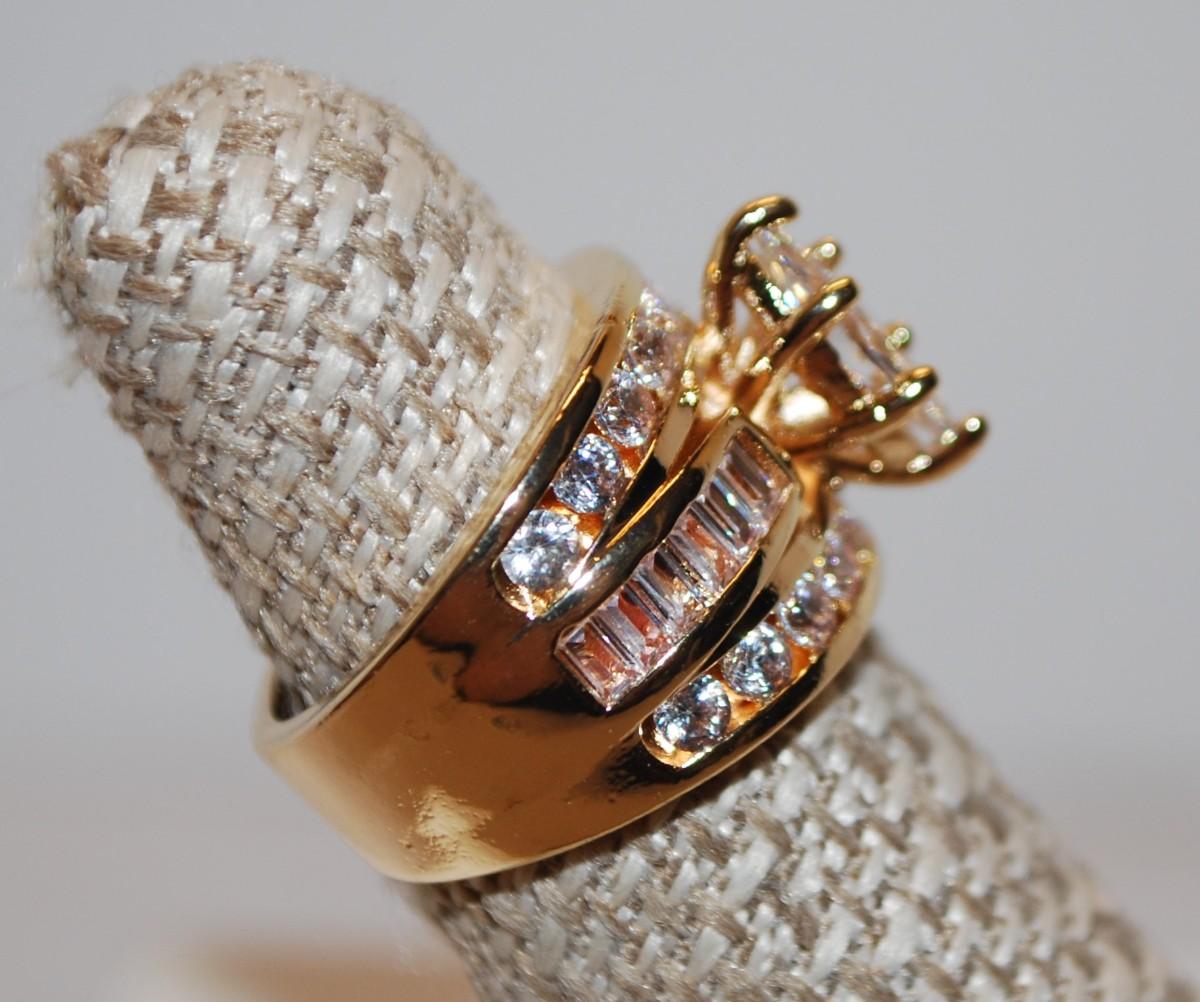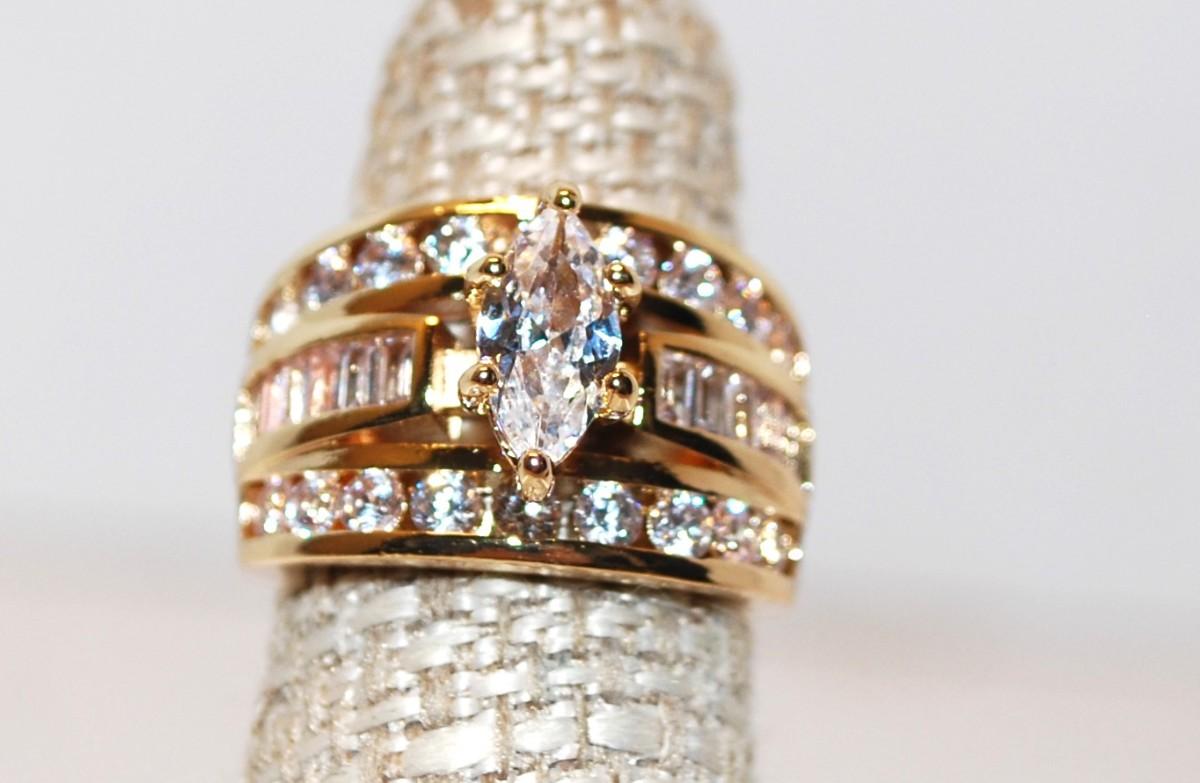 Size 6 Large Marquise Cut Clear Stone STERLING .925 Ring with a Gold Tri-Band Filled with Pink/Clear Accent Stones (8.6g)