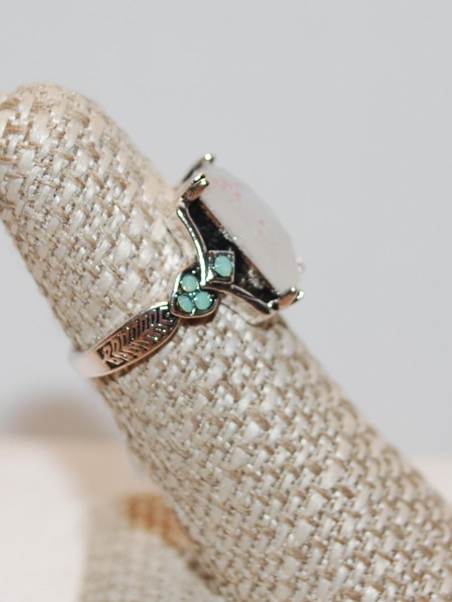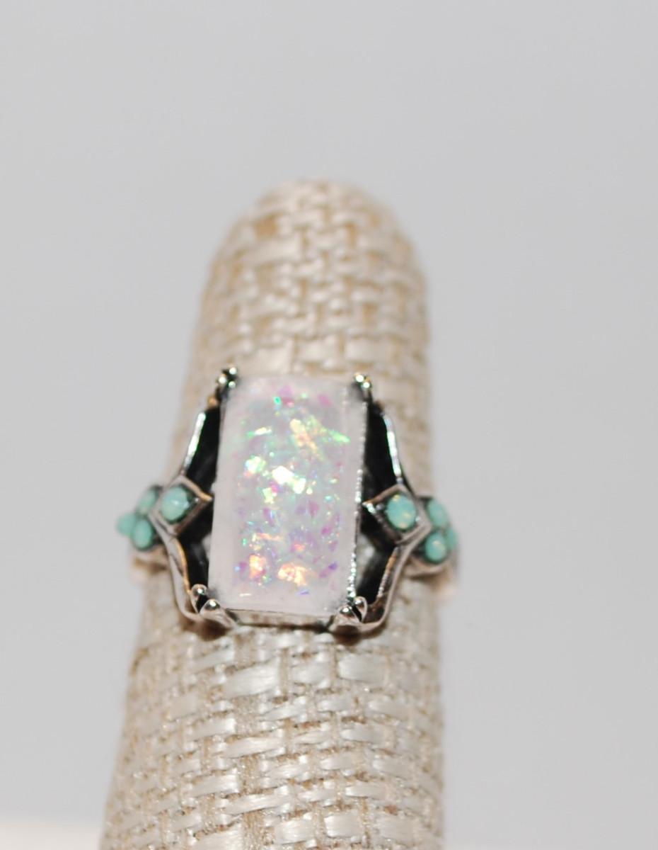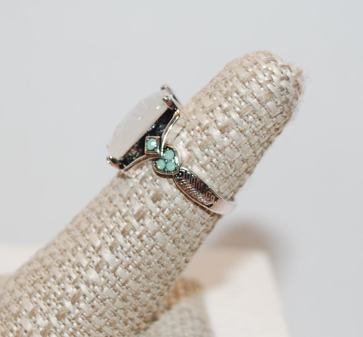 Size 6 ¼ Beautiful Rectangle White Fire Opal with 8 Sea Green Accent Stones (3.8g)