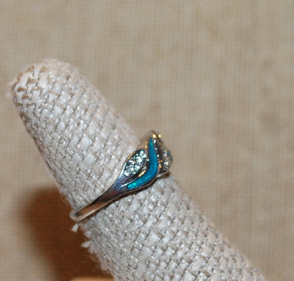 Size 6¾ Aquamarine Swirl Waves Inlays Ring & Clear Accent Stones on a Silver Tone Band (3.2g)