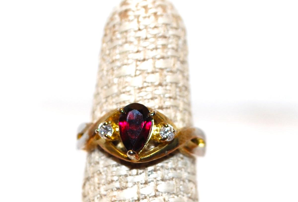 Size 6¼ Beautiful 3 Prong Pear Shape Ruby Colored Ring with 2 Side Accent Stones (3.6g)