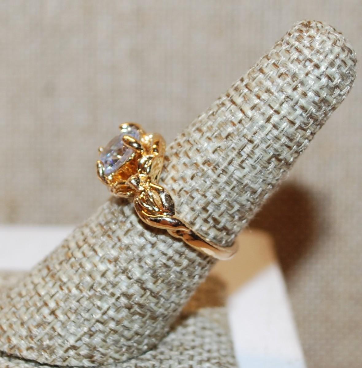 Size 6¾ Blue Hue Center Clear Stone Ring on a Dark Gold Tone Band (3.3g)