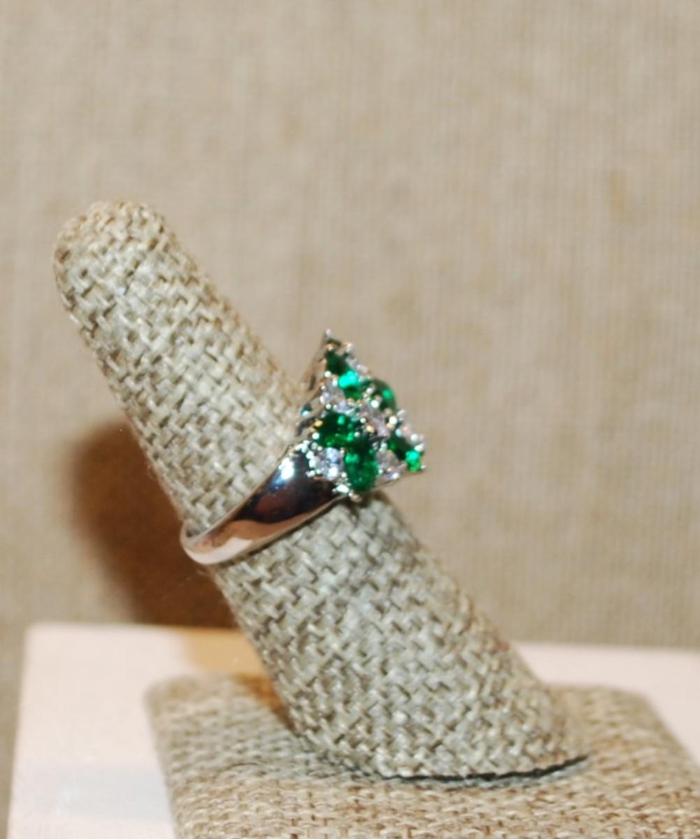 Size 6 Cocktail Style Ring with 9 Green Stones & Round Accent Stones on a Silver Tone Band (5.4g)