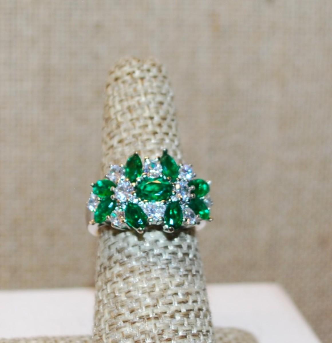 Size 6 Cocktail Style Ring with 9 Green Stones & Round Accent Stones on a Silver Tone Band (5.4g)