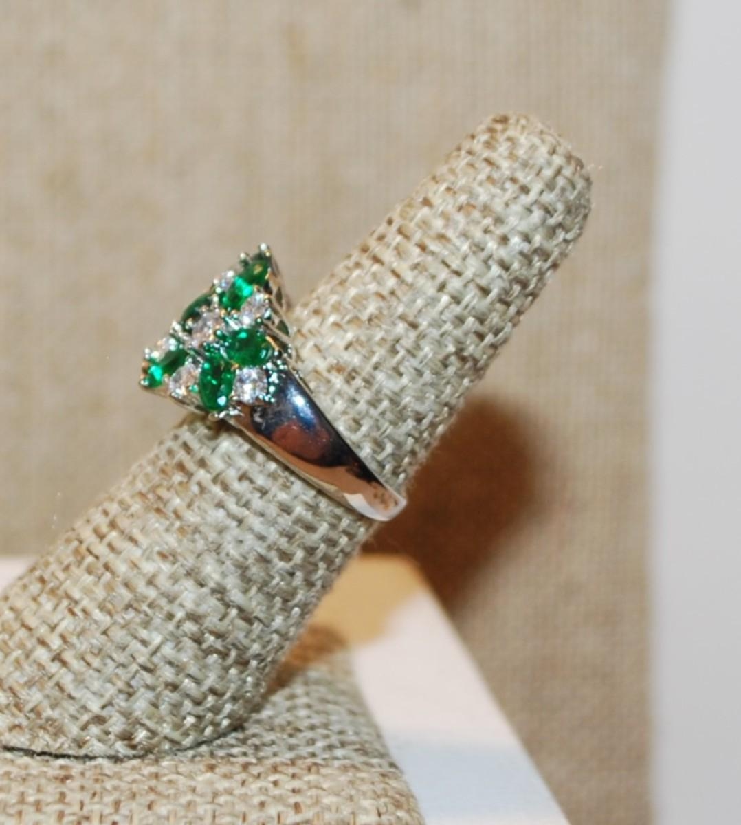 Size 6 C-Party Style Ring with 9 Green Stones & Round Accent Stones on a Silver Tone Band (5.4g)