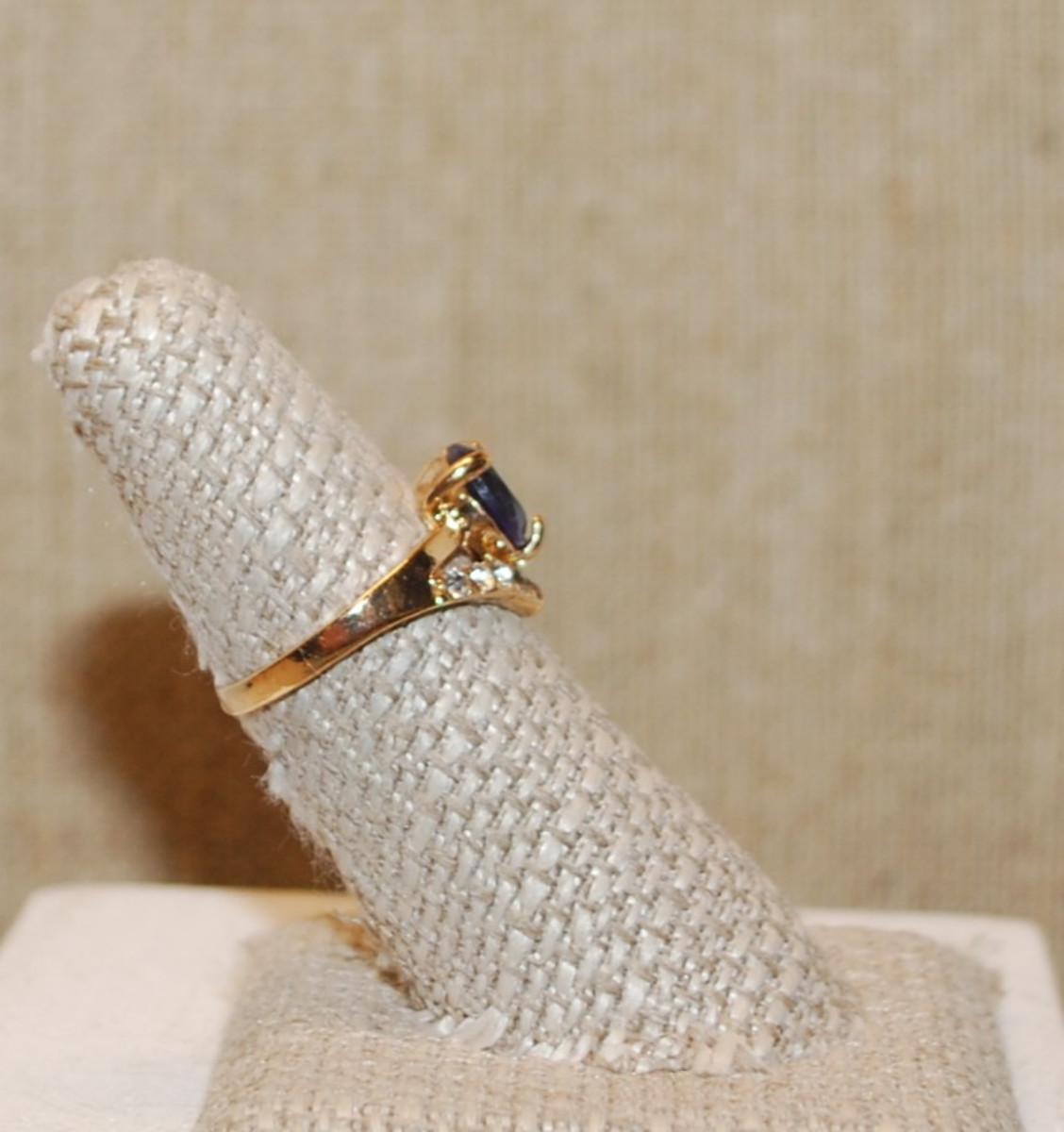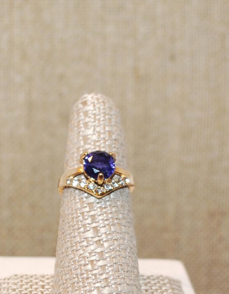 Size 6¾ Deep Purple Round Main Stone Ring with a "V" Clear Stone Accent on a Gold Tone Band (2.7g)