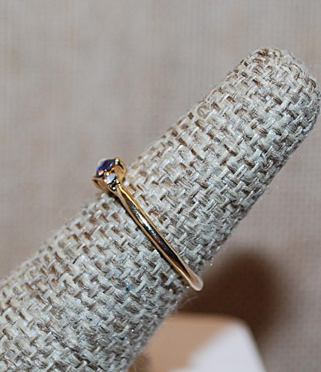 Size 6½ Delicate Round BLUE Stone Ring & 2 Opaque White Side Stones on a Gold Tone Band (1.1g)