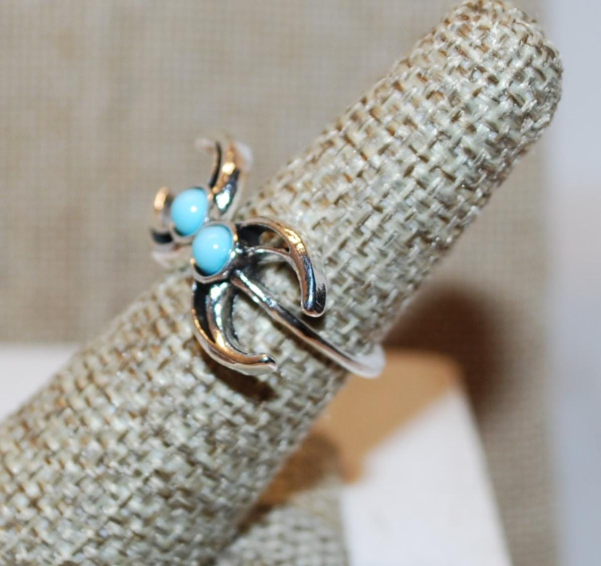 Size 6 Double Horseshoes and Turquoise Stones Ring on a Silver Tone Band (1.7g)