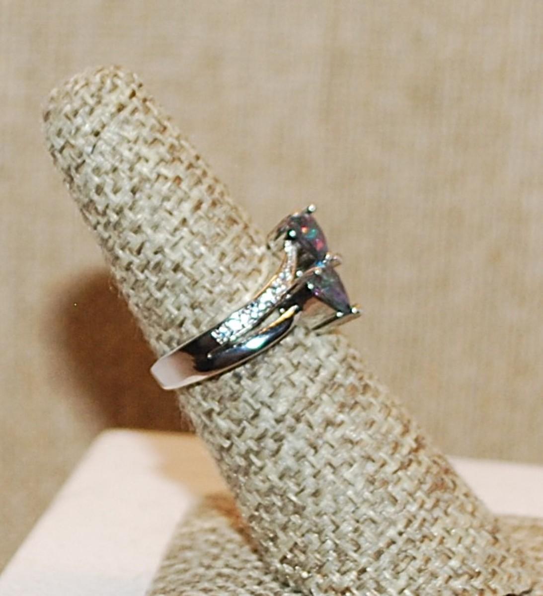 Size 6 Double Iridescent HEARTS Ring with Clear Stones Sides on an Overlap Silver Tone Band (3.2g)