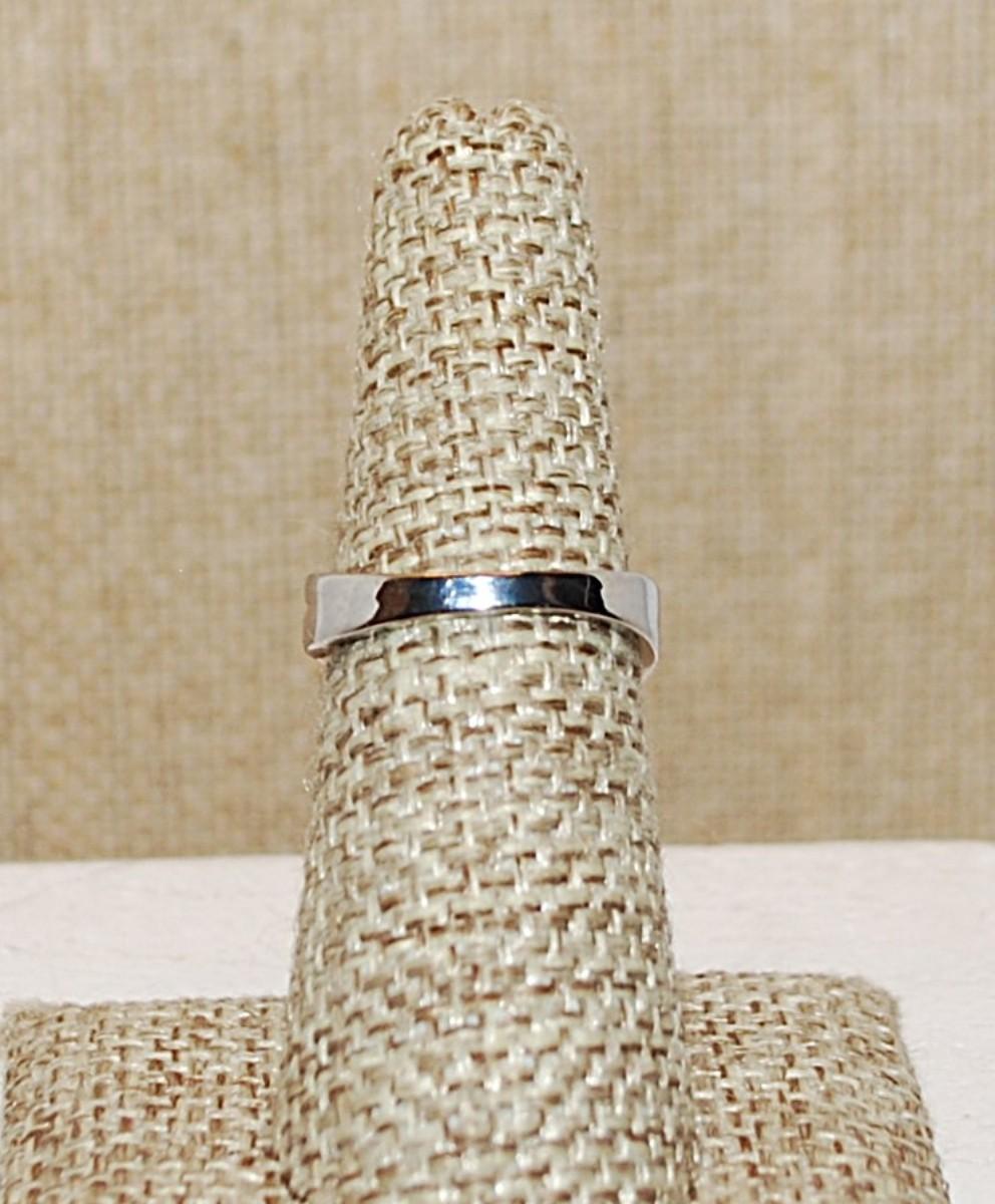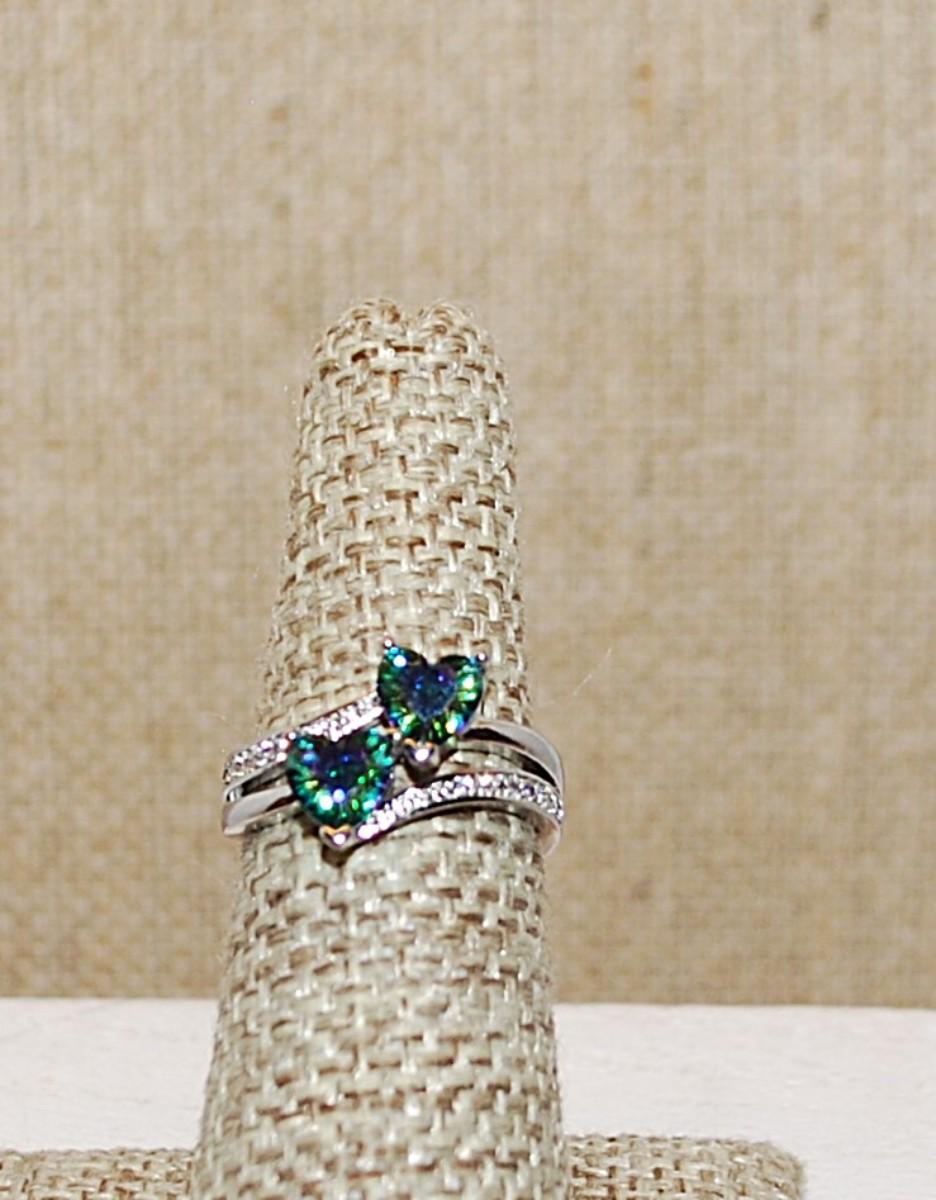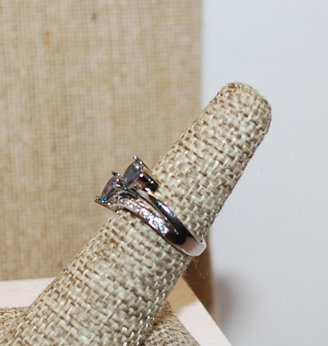 Size 6 Double Iridescent HEARTS Ring with Clear Stones Sides on an Overlap Silver Tone Band (3.2g)