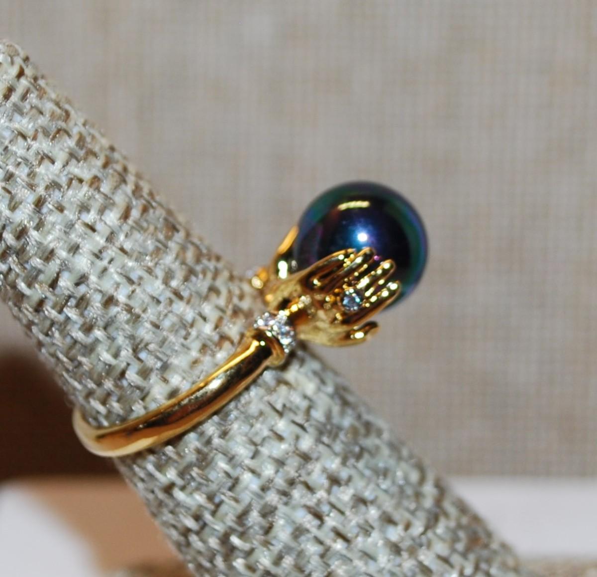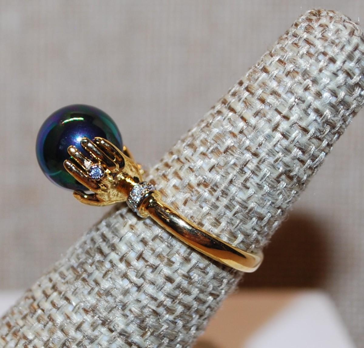 Size 6¼ Faux Iridescent Pearl Held by "Hands" with Accent Stones Ring on a Gold Tone Band (4.4g)