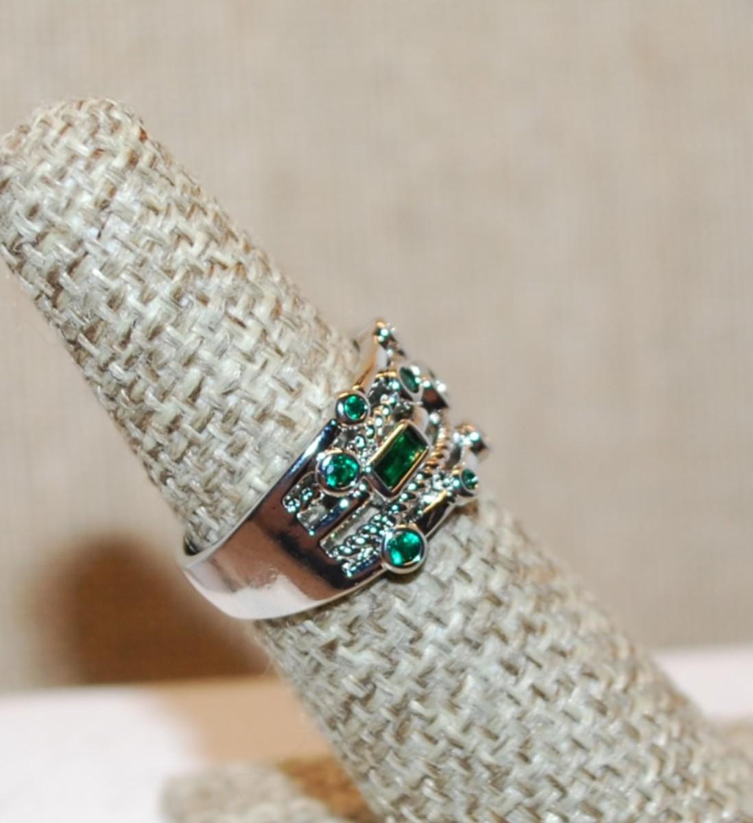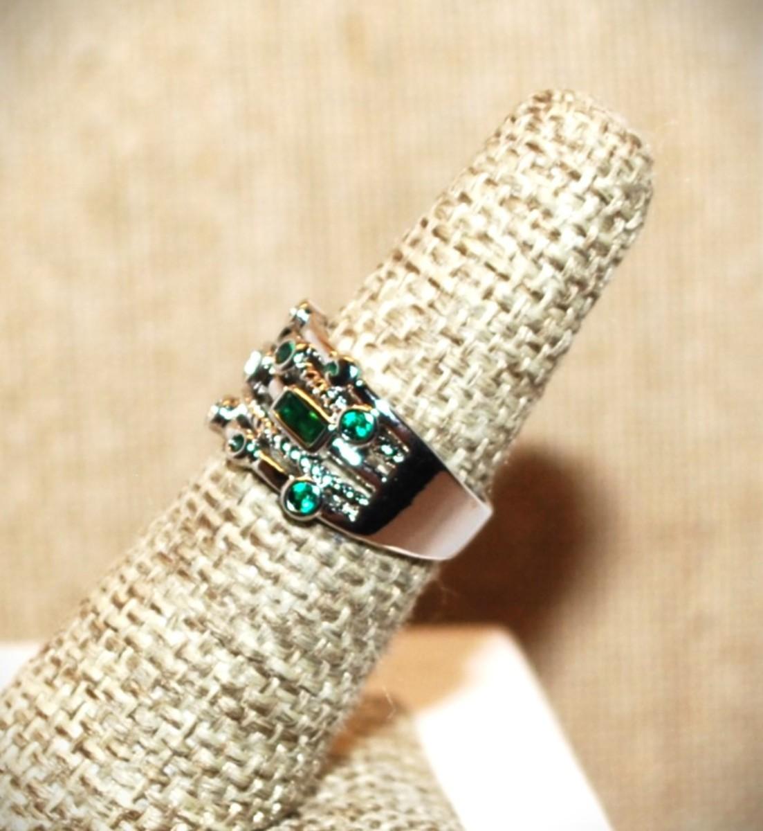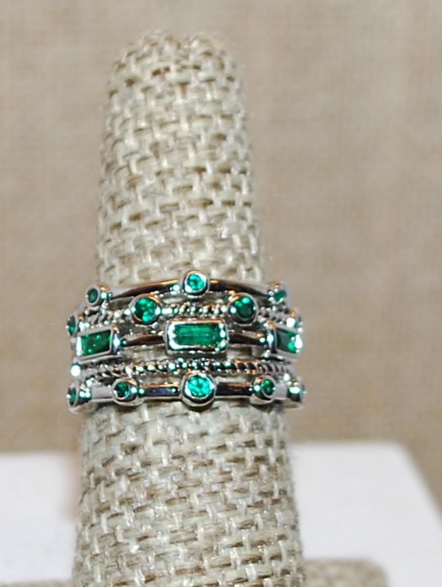 Size 6 GREEN Staggered "Circles & Rectangles" Ring on a Silver Tone Open Band (4.7g)