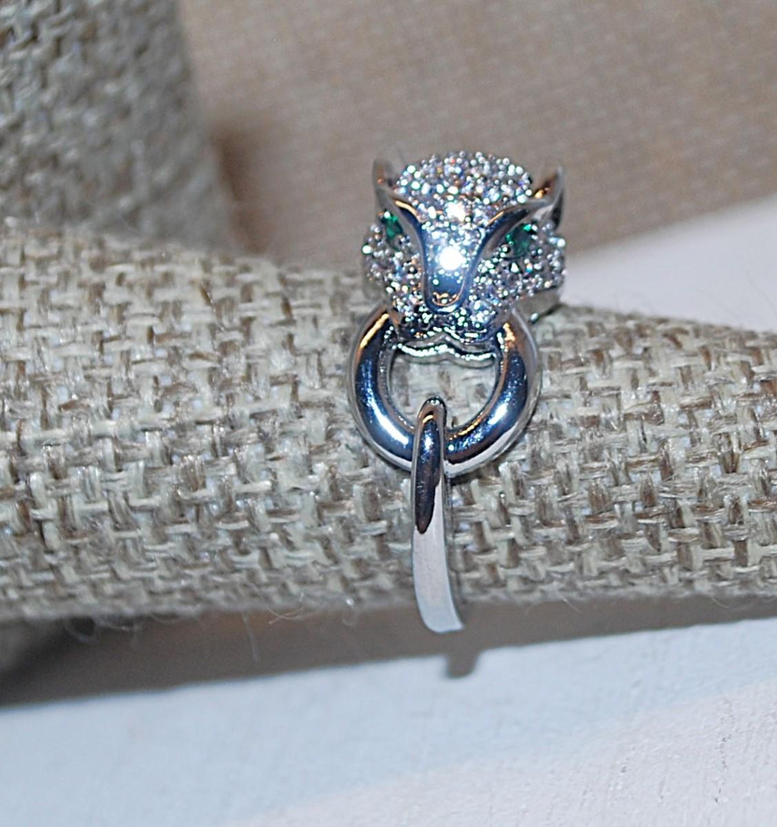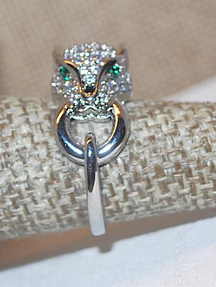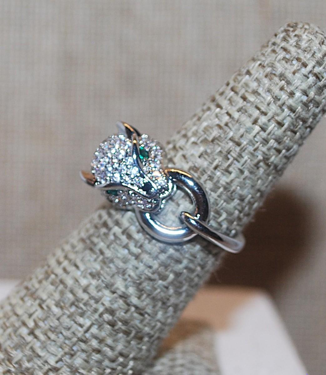 Size 6 Green-Eyed Leopard Cat Ring with Looped Setting on a Silver Tone Band (4.0g)