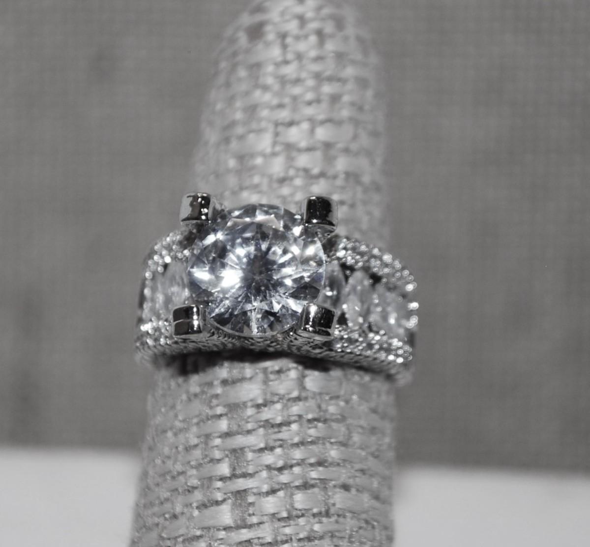 Size 6¾ "Highrise" Large Round Clear Stone Ring in a 4-Point Setting with Accents Adorned Silver Tone Band (7.4g)