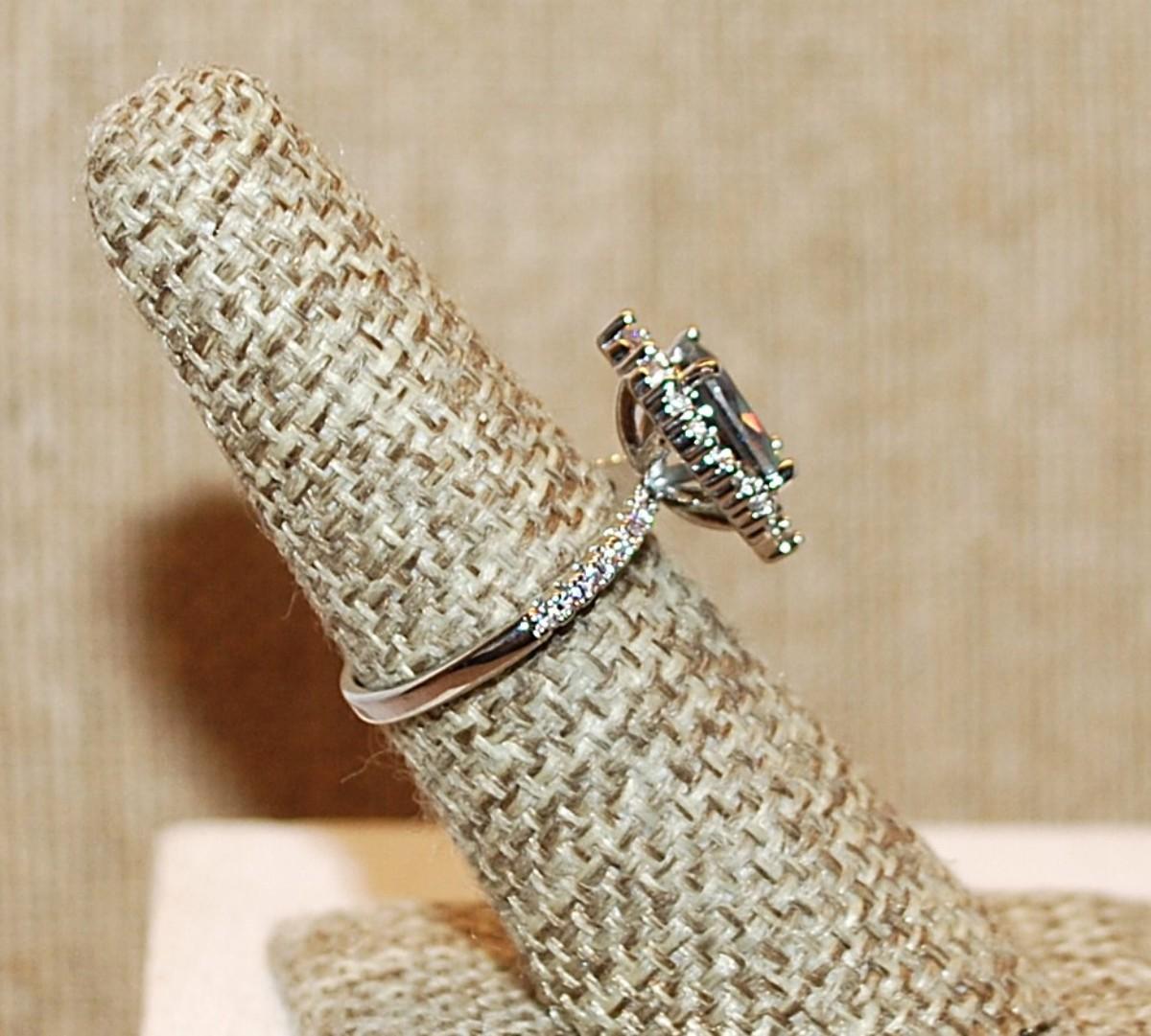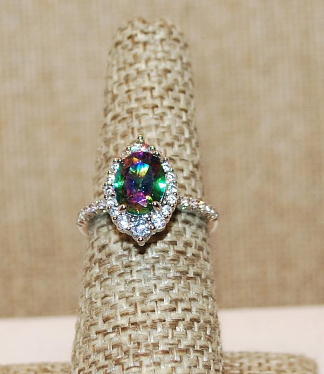 Size 6 Iridescent Pointed Oval Main Stone with Full Surround & Accents on a Silver Tone Band (3.4g)