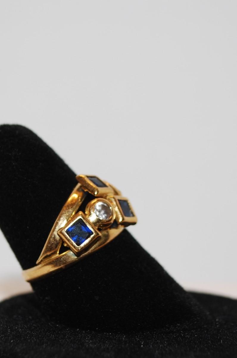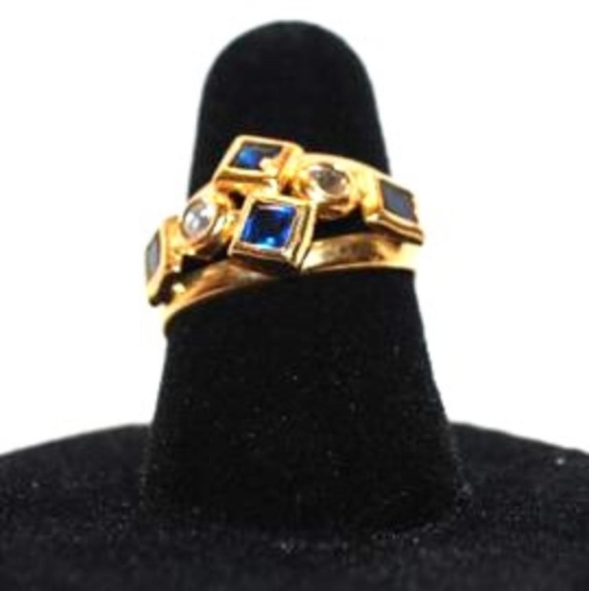 Size: 6 Italian Square Blue Stones and Round Clear Stones Zirconia on Yellow Gold Band (2.0g)