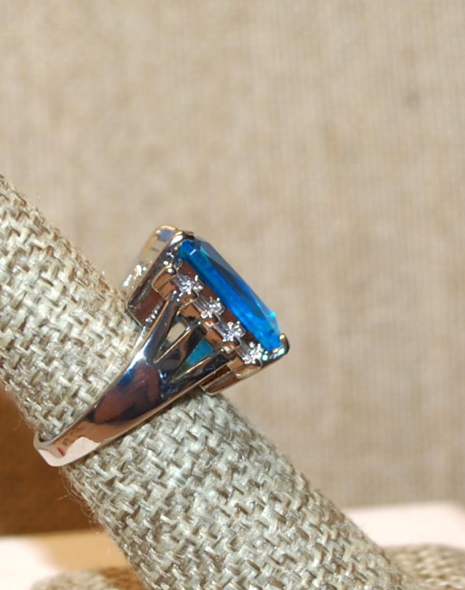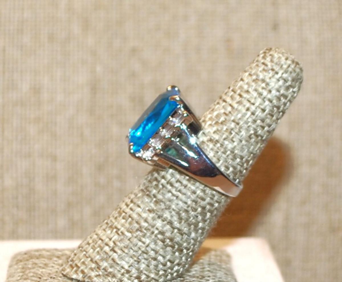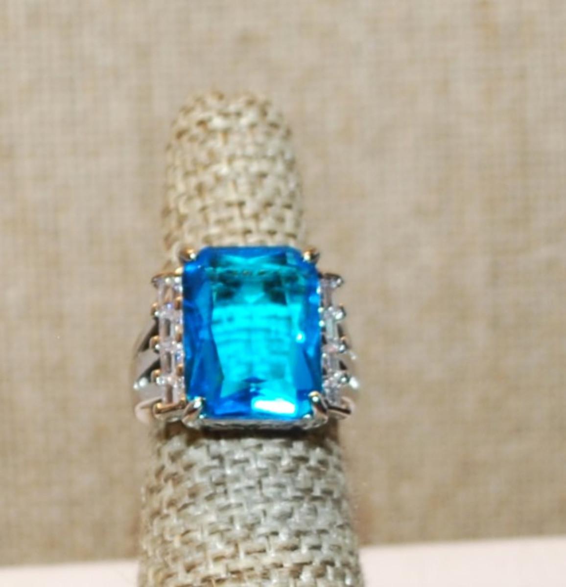 Size 6 Large Blue Rectangle Stone Ring with Vertical Side Accents on a Silver Tone Band (8.0g)