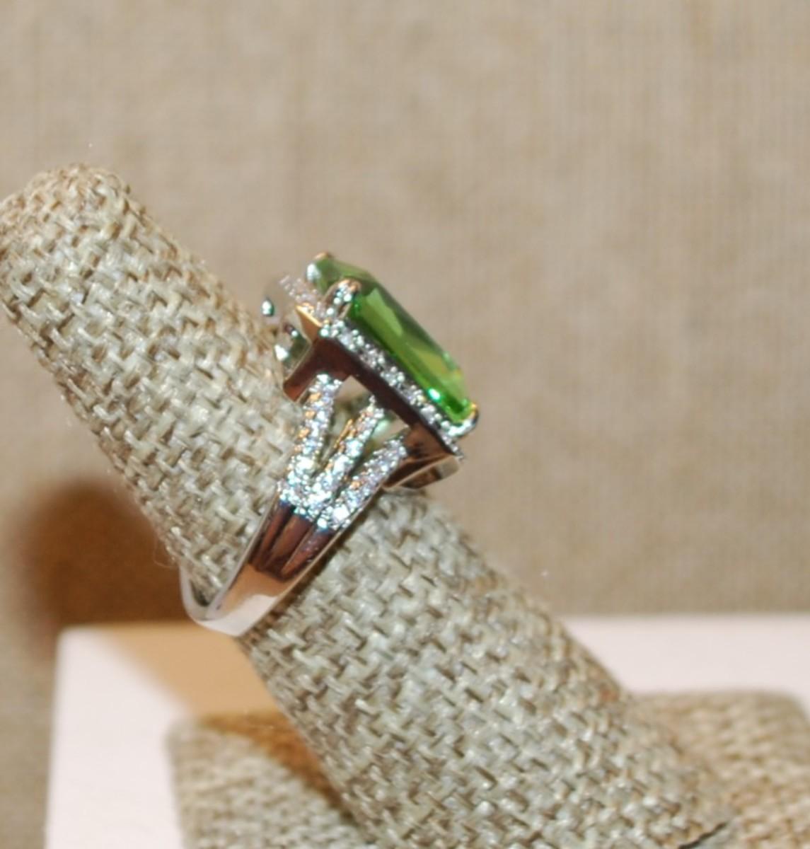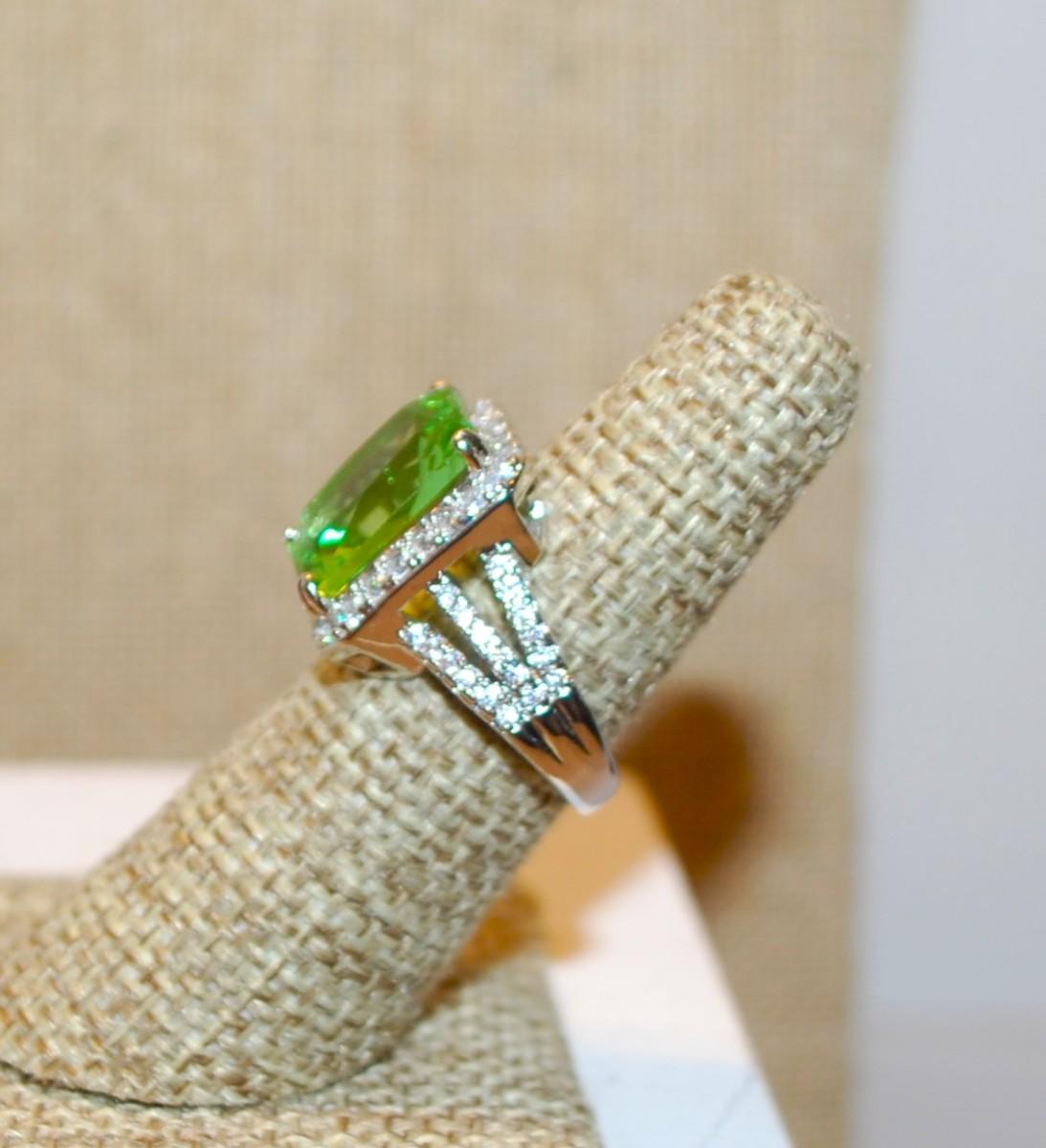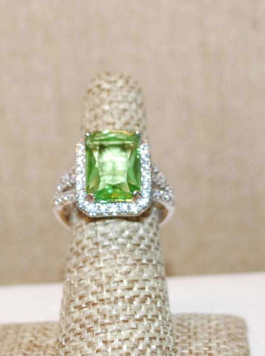 Size 6½ Large Emerald Cut Transparent Lime Green Stone Ring with Full Clear Stones Surround & Accents on a Silver Tone Band (6.8g)