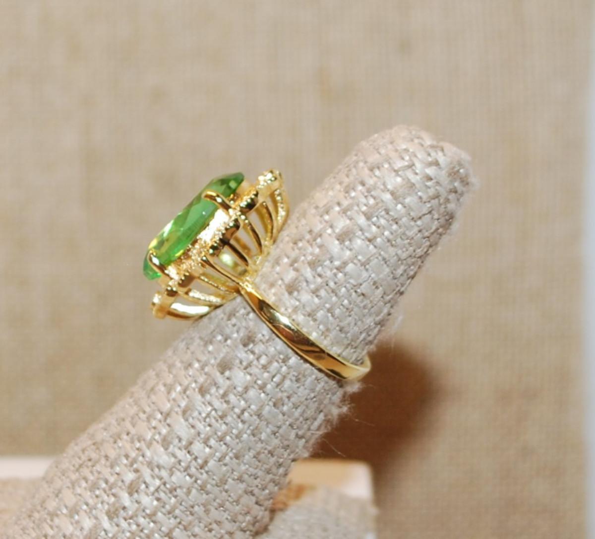 Size 6½ Large Key Lime Green Oval Stone Ring with Surrounds on a Nested Style Setting and Gold Tone Band (5.1g)