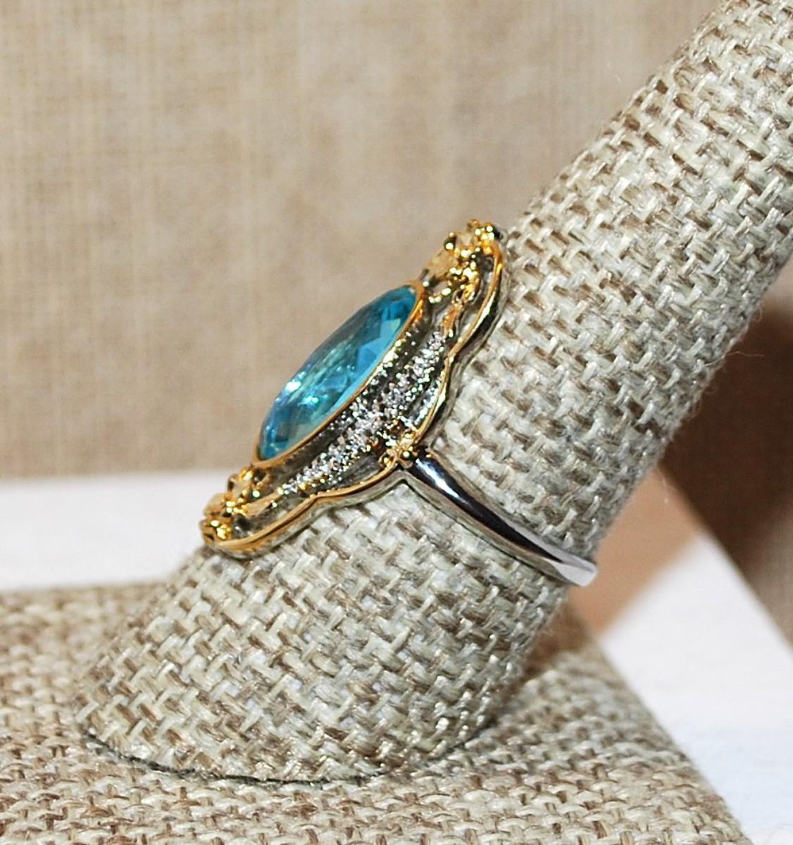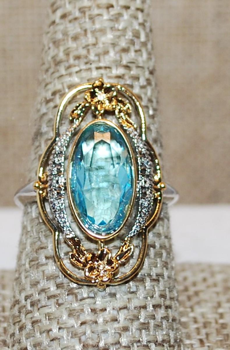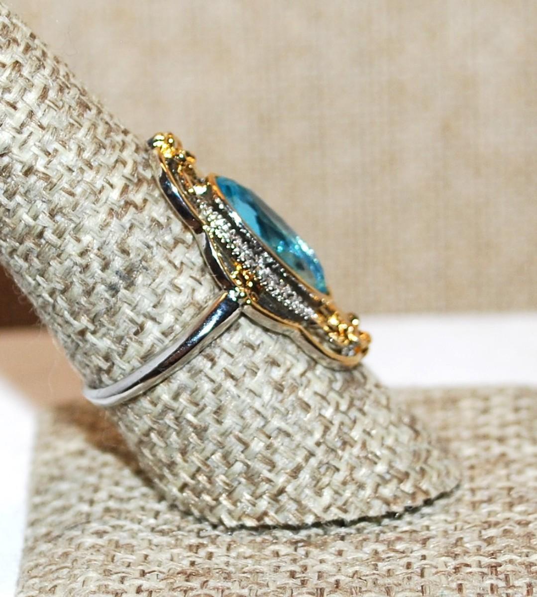 Size 6 ½ Large Long Translucent Light Blue Oval Stone 2-Tone Ring on a Silver Tone Band (3.9g)