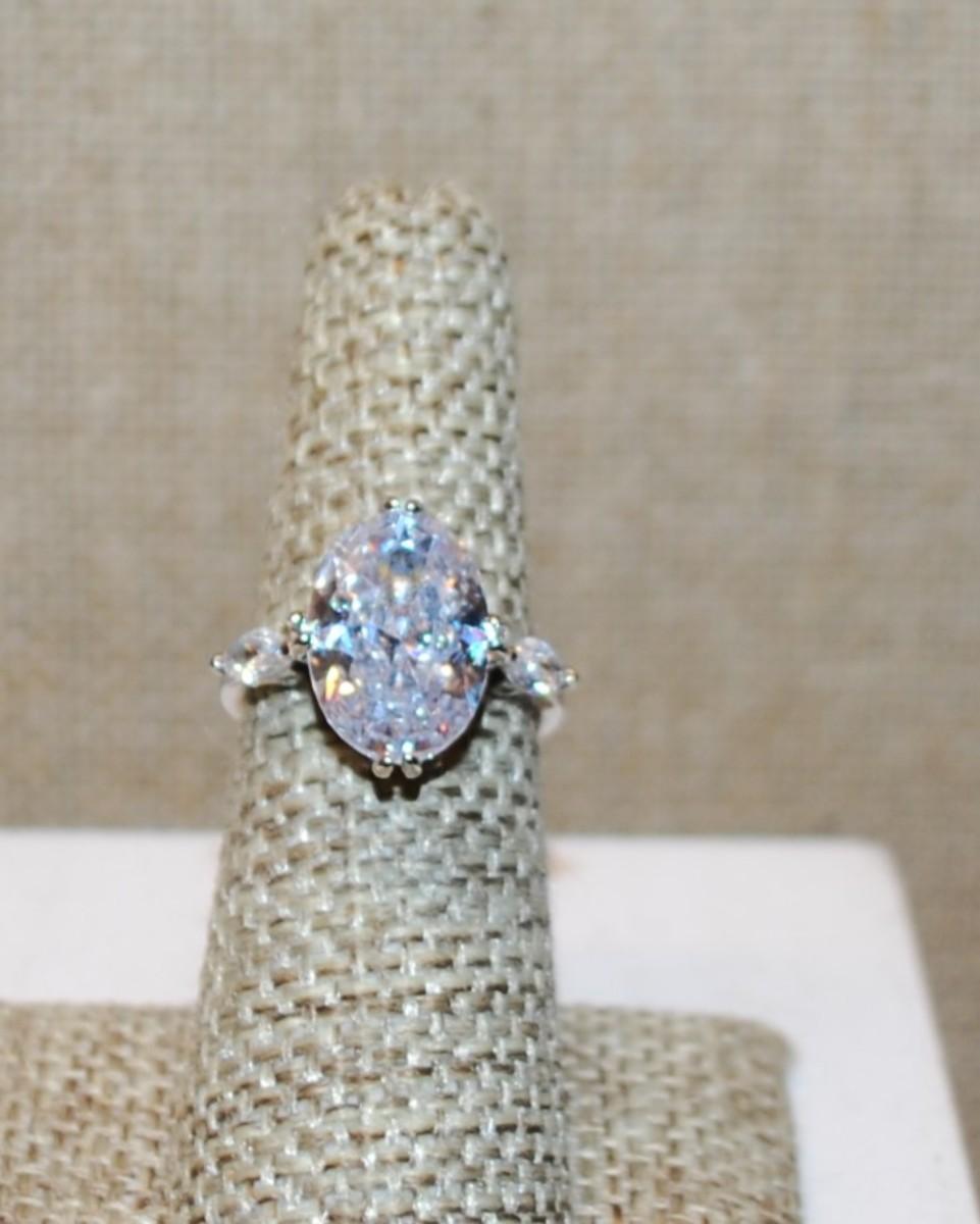 Size 6 Large Oval Clear Stone Ring with Horizontal Side Accents on a Silver Tone Band (4.4g)