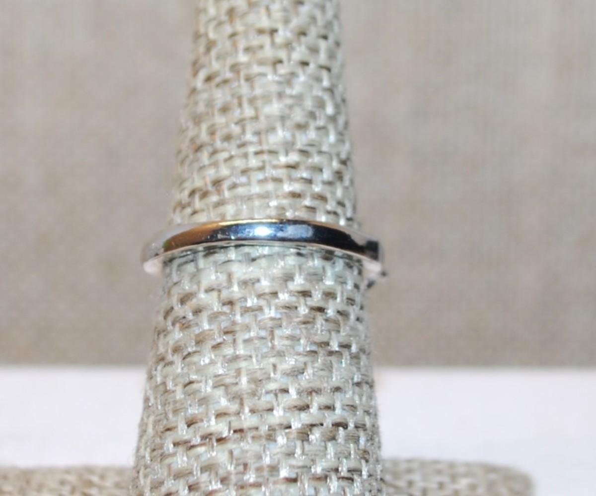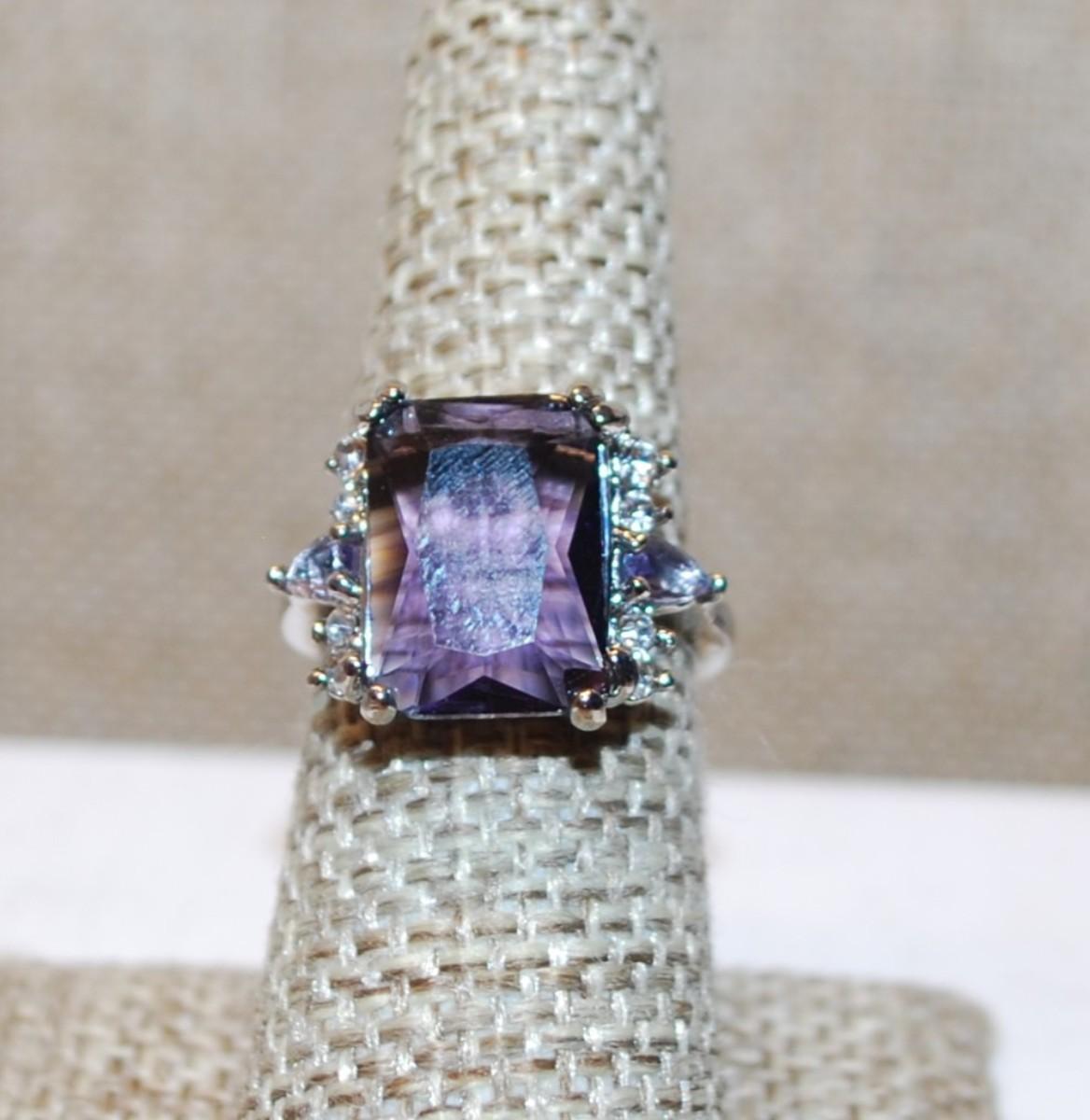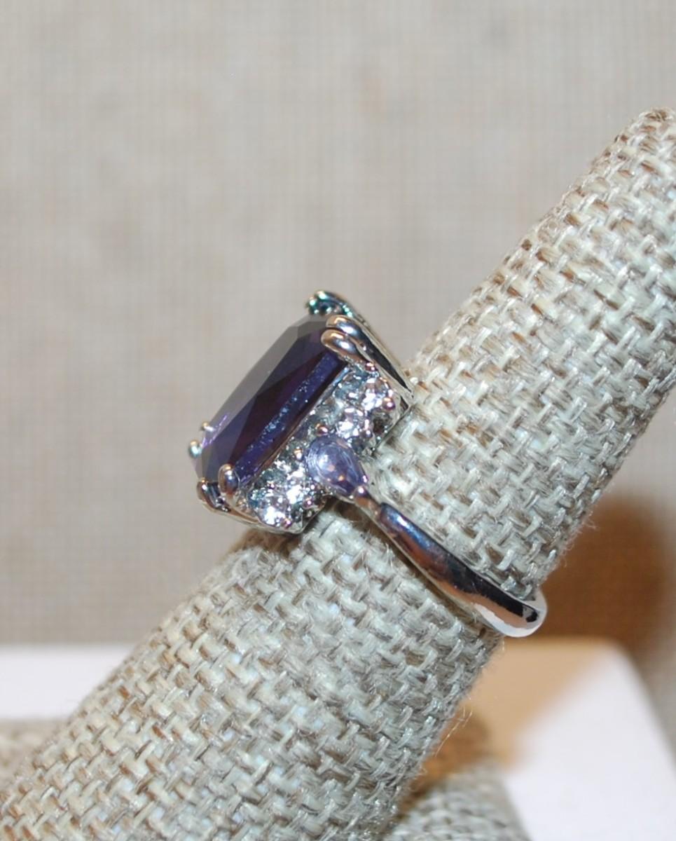 Size 6¾ Large Purple Emerald Cut Stone Ring with Vertical Accents Rows on a Silver Tone Band (5.5g)