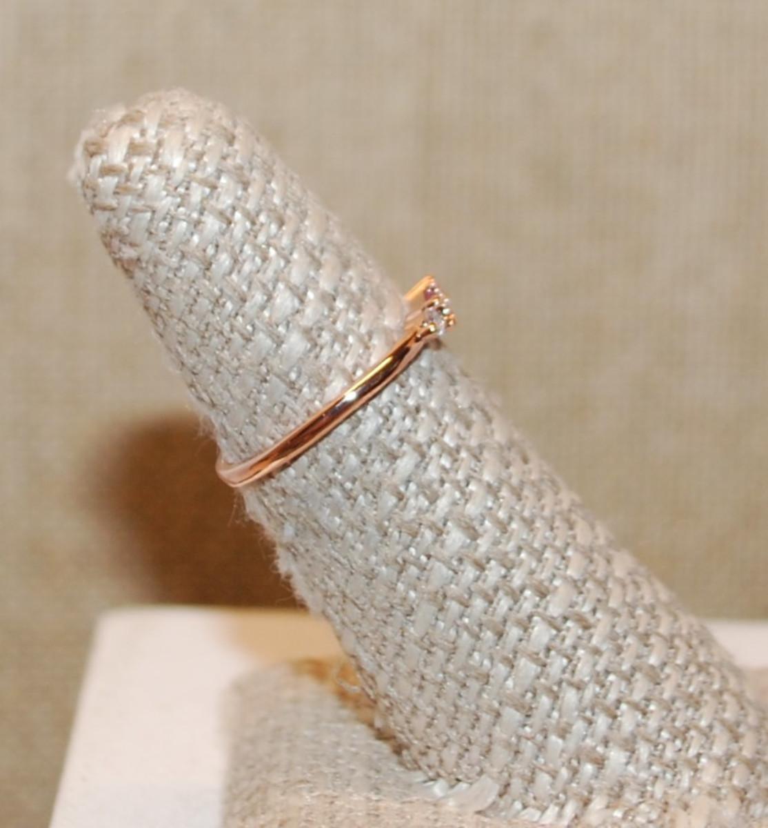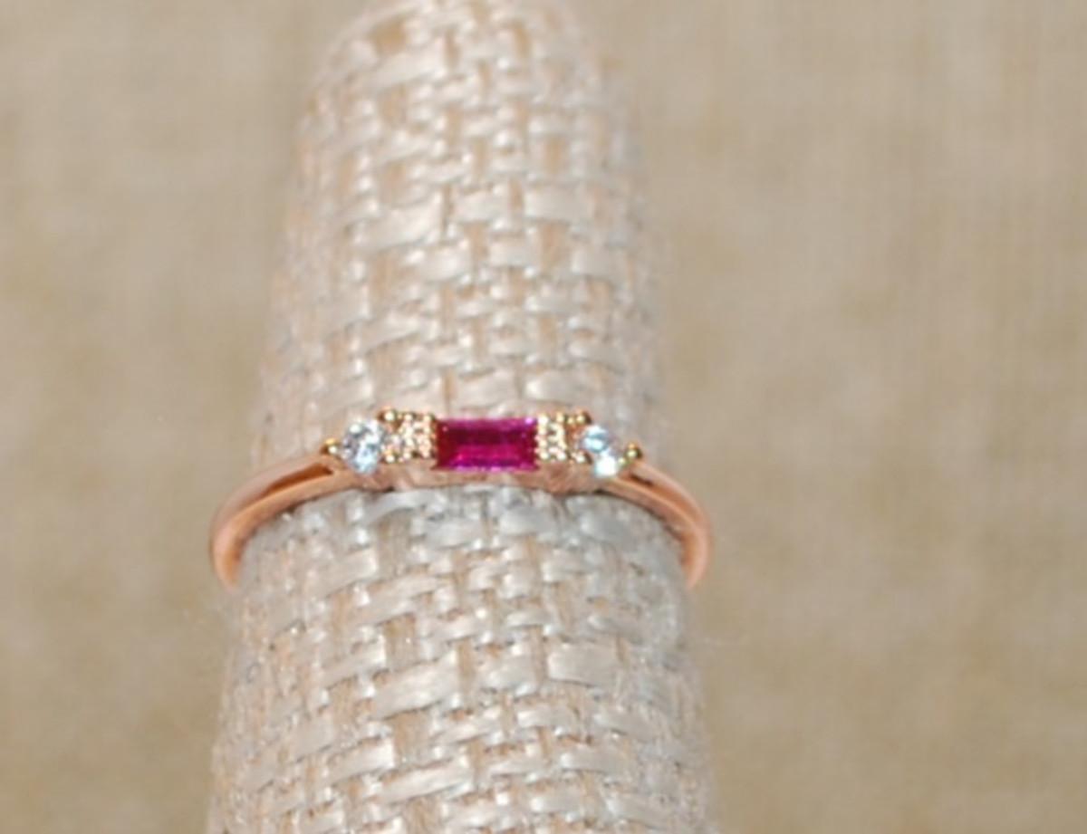 Size 6 Marked .925 Delicate RED Rectangle Stone ROSE GOLD Ring with 2 Round Clear Stone Sides on a Silver Filled Band (1.1g)