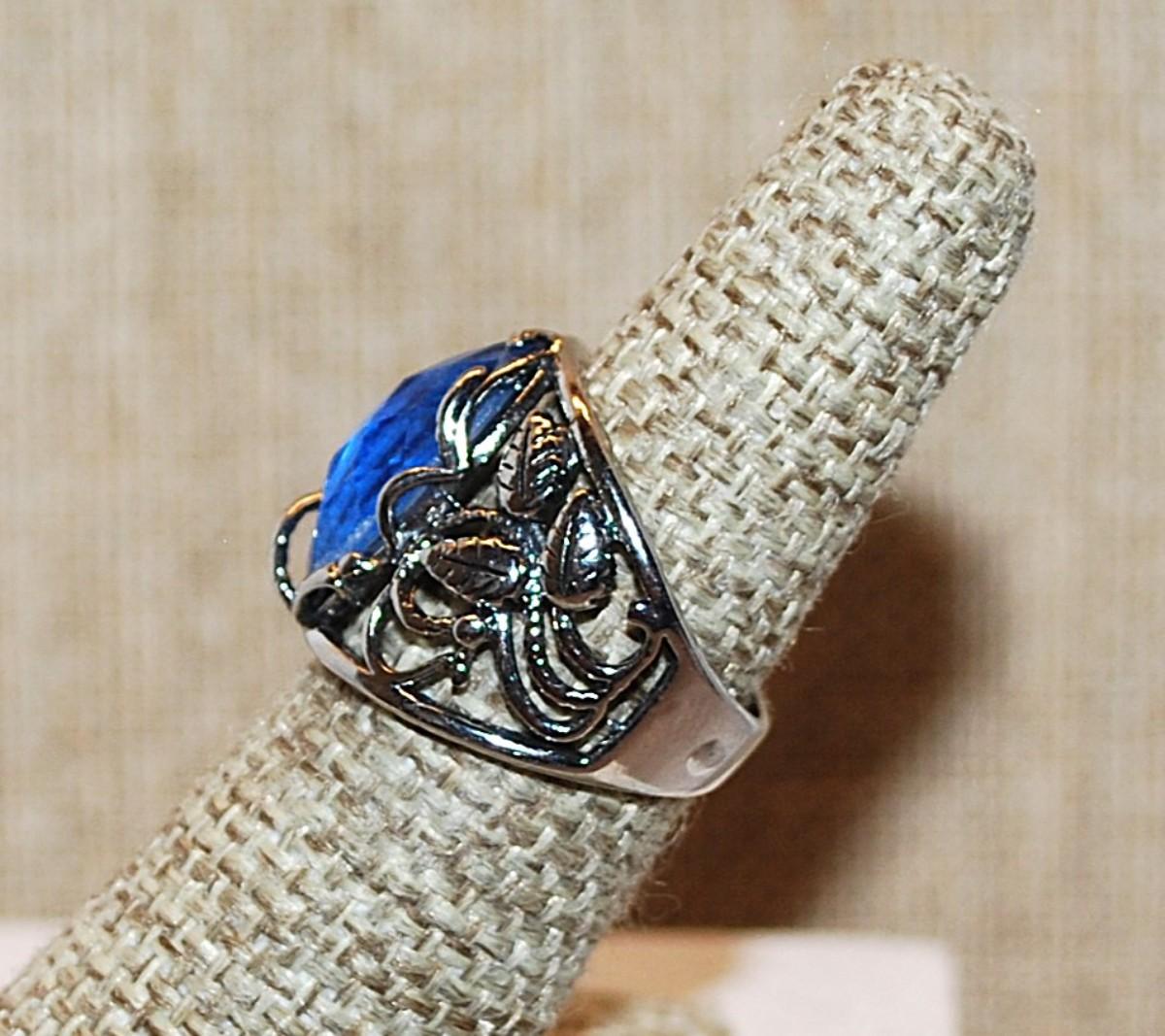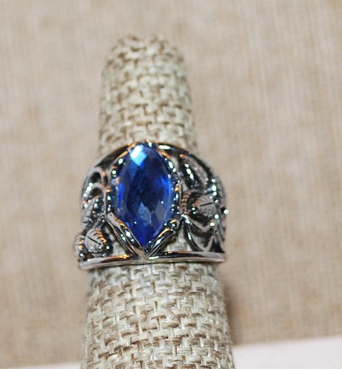 Size 6½ Marked .925 Large BLUE Marquise Cut Stone Ring with "Branch & Leaves" Side Accents on a Silver Band (5.6g)