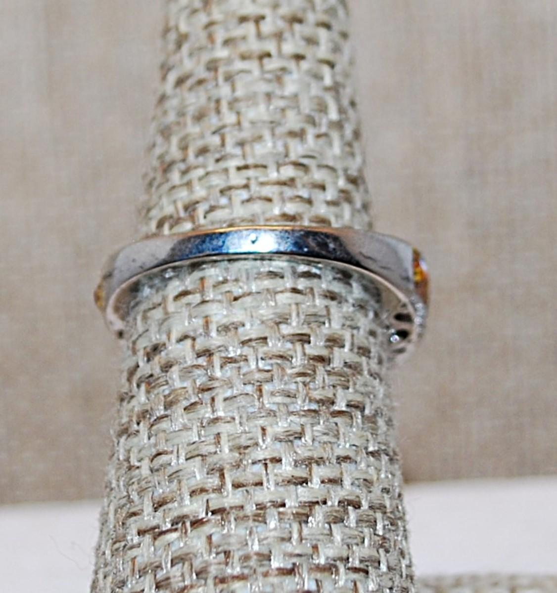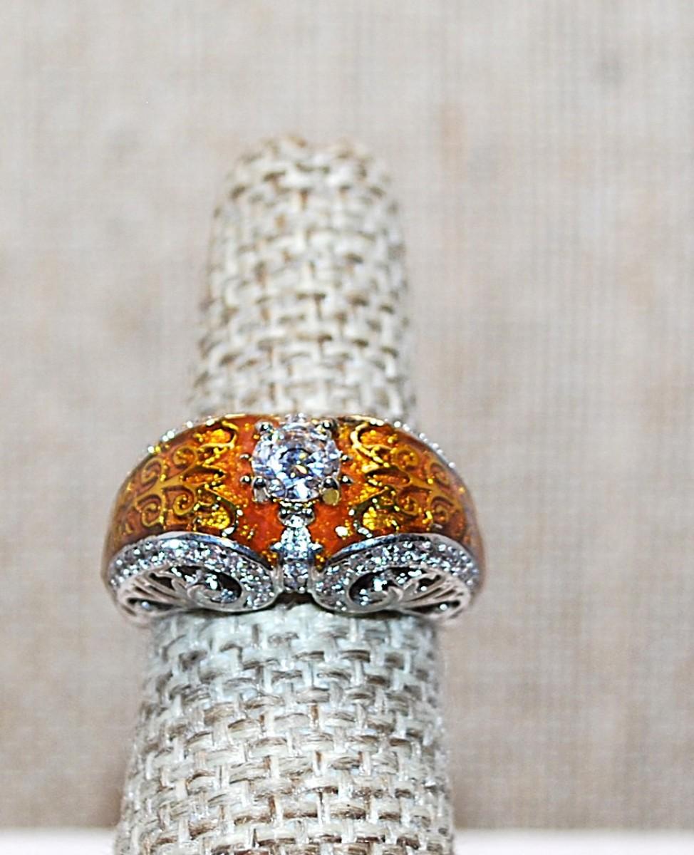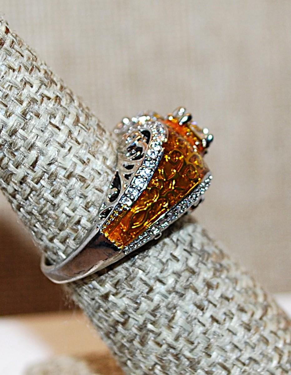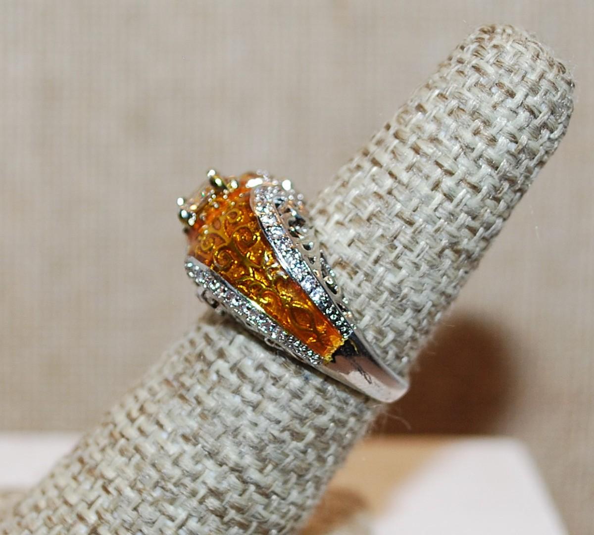 Size 6 ¼ Marked .925 "Puffy" AMBER ORANGE Party Ring with a Single Main Clear Round Stone on a Silver Band (6.1g)