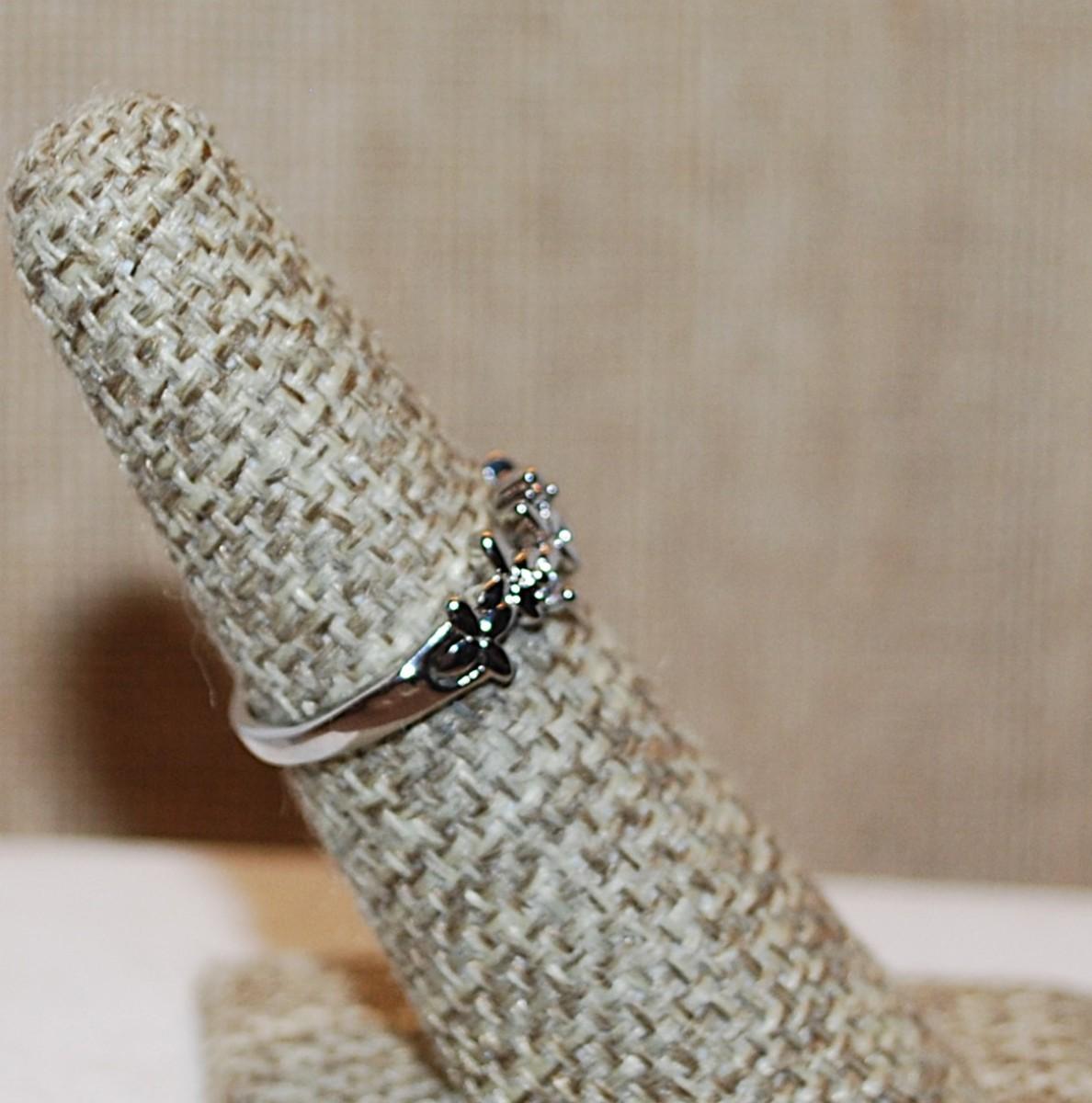 Size 6 Marked .925 Tiny Group of 4 Stones Ring on a Graphic Flowered Silver Band (2.1g)